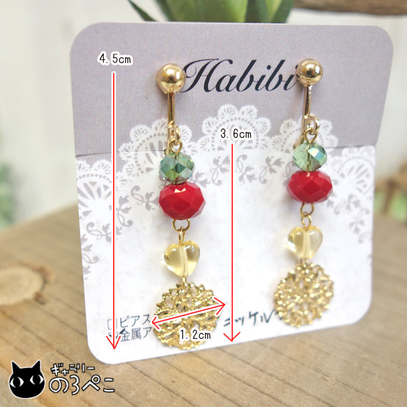 チェコガラスビーズのハートが揺れるグリーン&レッドのイヤリング bc870-37