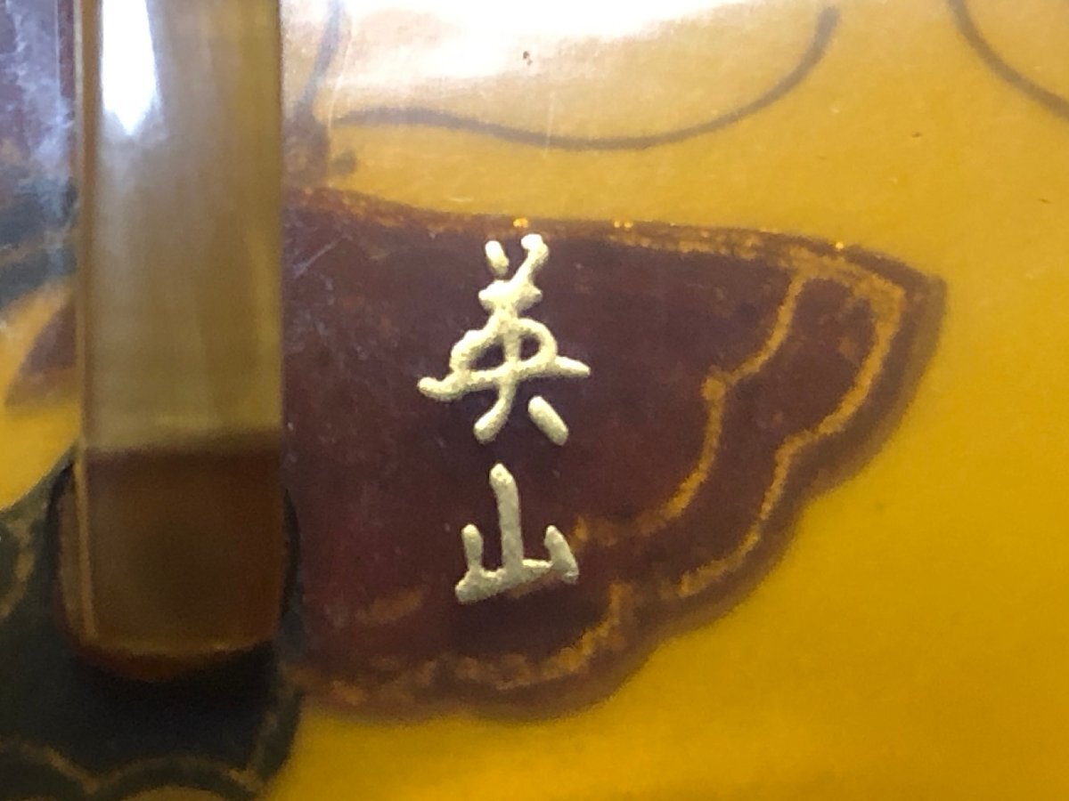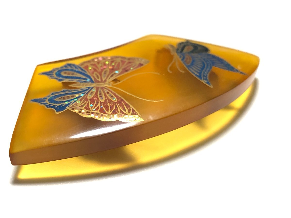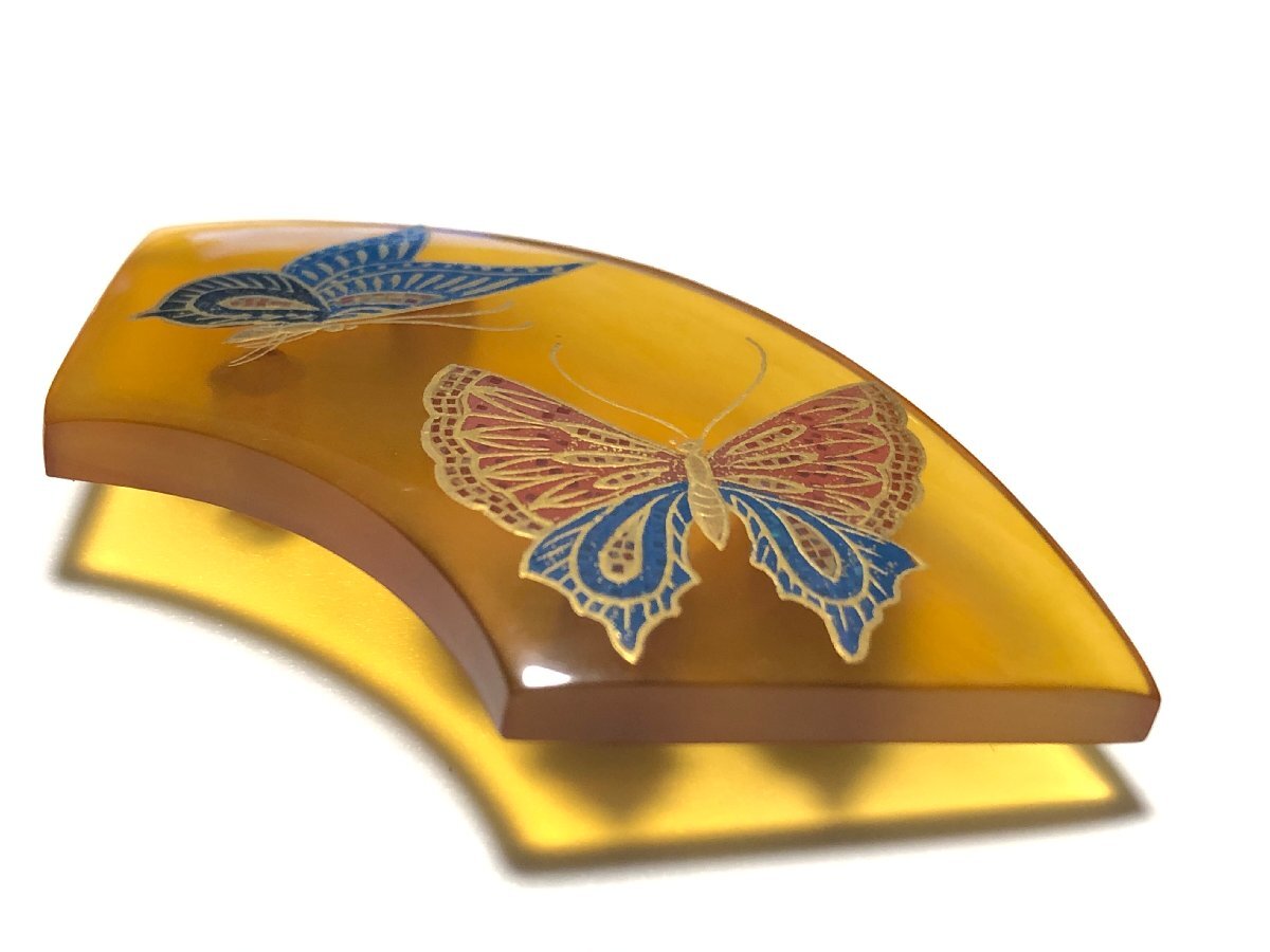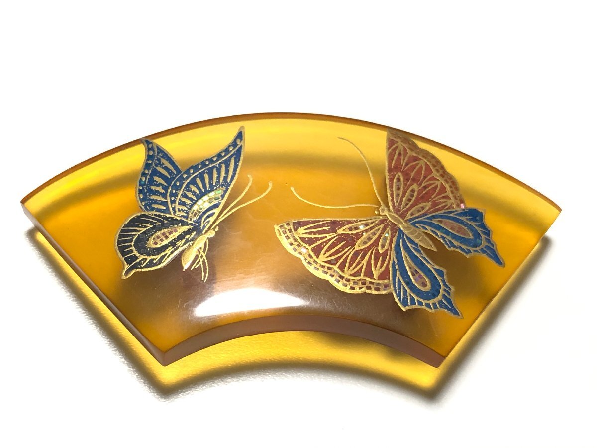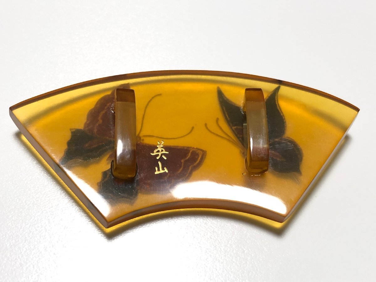 アンティークの白甲の本鼈甲を使用し、金蒔絵、螺鈿で蝶文を施した、扇細工の帯留めです。作者、英山の銘があります。鼈甲部分に欠けや虫食いはありません。鼈甲表面の艶が若干無くなっています。