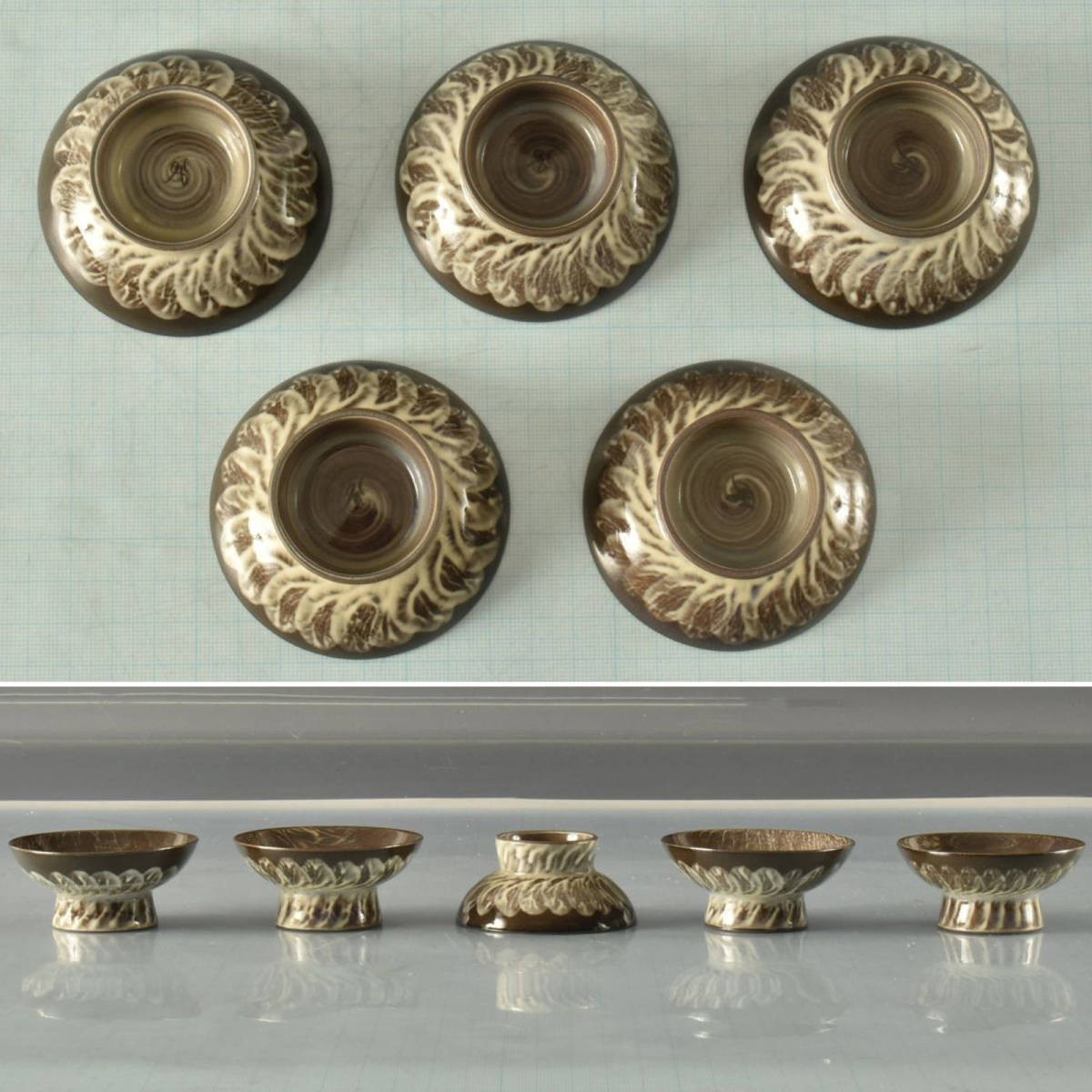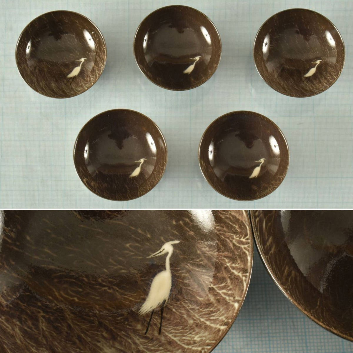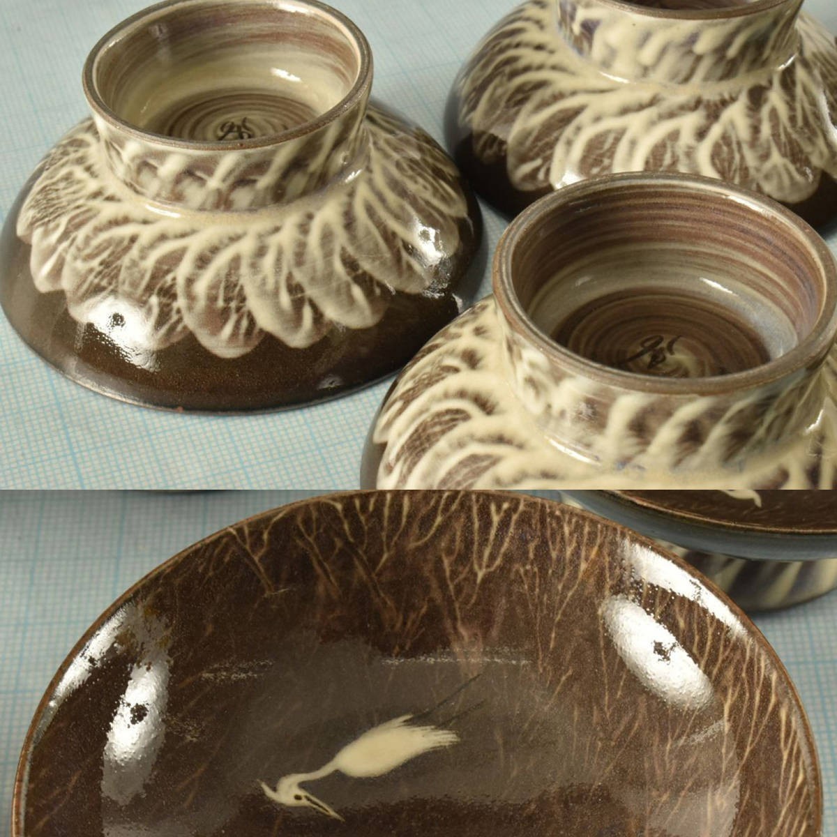 T11420 十三代 横石臥牛 現川焼白鷺文盃 5客:真作