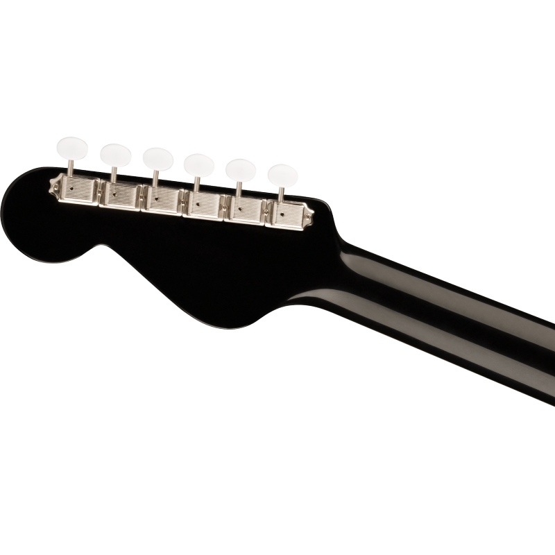 ネックには人間工学に基づいたモダンな"V"シェイプを採用し、温かみのあるトーンレスポンスを生み出す25インチのスケール長、ティルトバック式6インラインヘッドストック、メイプルヘッドキャップなど、フェンダーのエレキギターDNAから生まれた独特のルックスを備えています。バインディングされたオバンコール指板には当時の雰囲気を再現するパーロイドのブロックインレイが施されています。スムーズで正確なチューニングを可能にするヴィンテージスタイルのチューニングマシン、優れたハーモニクスを生み出すボーンナットとサドルなどのディテールも特徴です。