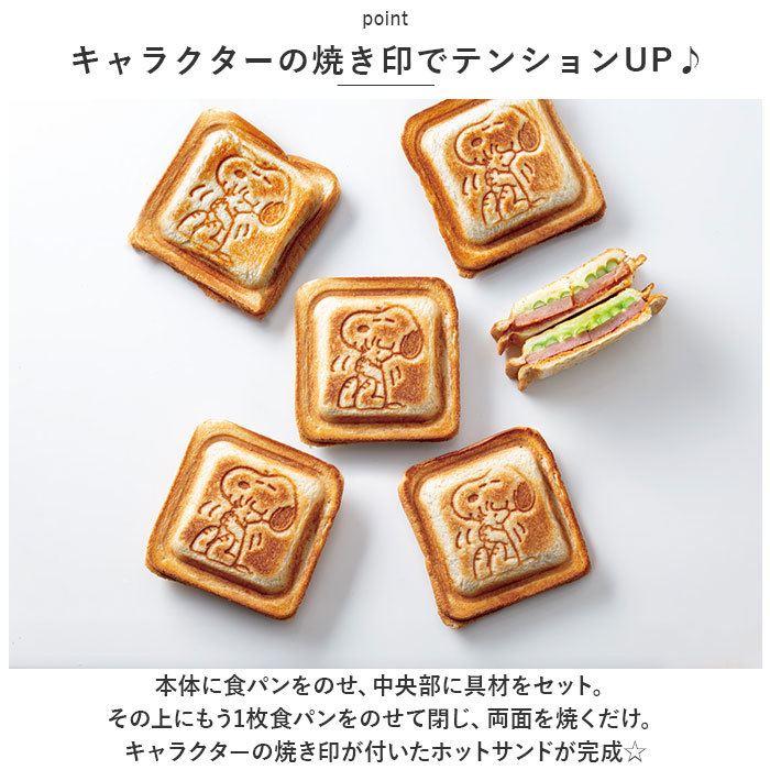 商品説明 | ・・笑顔がこぼれる可愛いホットサンドの焼き上がり♪「キャラクター アルミ製ホットサンドパン」が新登場。 ・【キャラクターの焼き印でテンションUP♪】 ・本体に食パンをのせ、中央部に具材をセット。その上にもう1枚食パンをのせて閉じ、両面を焼くだけ。キャラクターの焼き印が付いたホットサンドが完成☆ ・【手軽に使える軽量設計】 ・本体は軽量なアルミ製なので、取り扱いがラクラク。ヒンジは取り外しOK。(※両面に焼き印加工がされているので、分解して使ってもキャラクターの焼き印がつきます。) ・【自宅でも屋外でも】 ・ご家庭ではもちろん、アウトドアシーンでも大活躍の直火タイプ。休日の朝食や屋外で食べるホットサンドが、より美味しくなること間違いなし☆ ・【スリムなフォルム】 ・収納棚の隙間にサッと忍ばせておけるスリム形状。屋外への持ち運びもラクラク。 ・【プレゼントにもぴったり】 ・キャラクターデザインの外箱入り♪キャラクター好きな方へ、結婚や引っ越しなど新生活のお祝いにもおすすめ。アレンジレシピが付属。 |