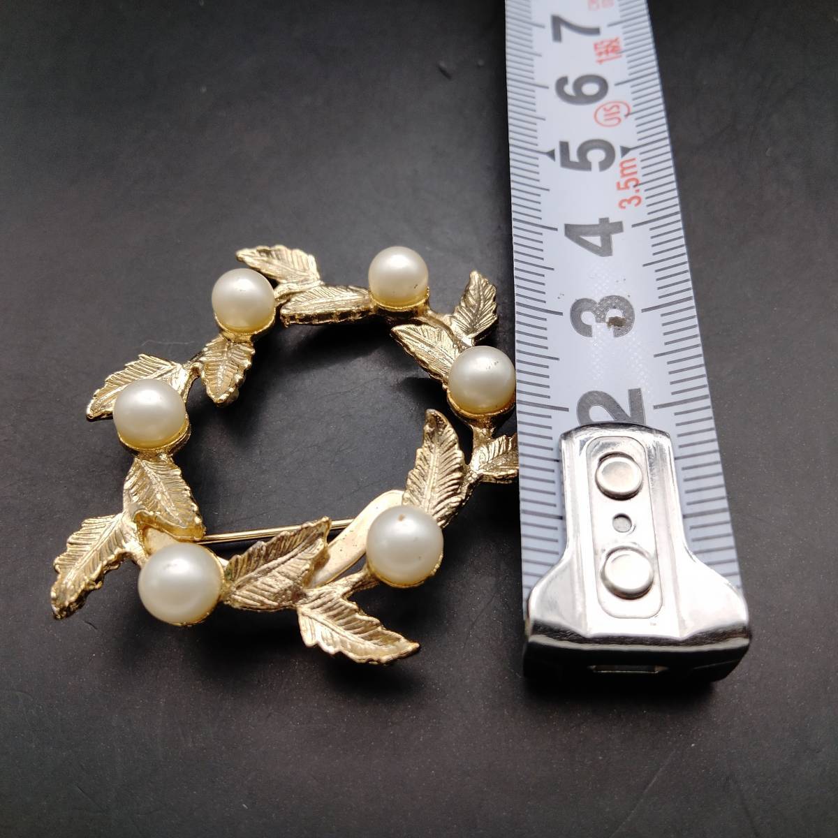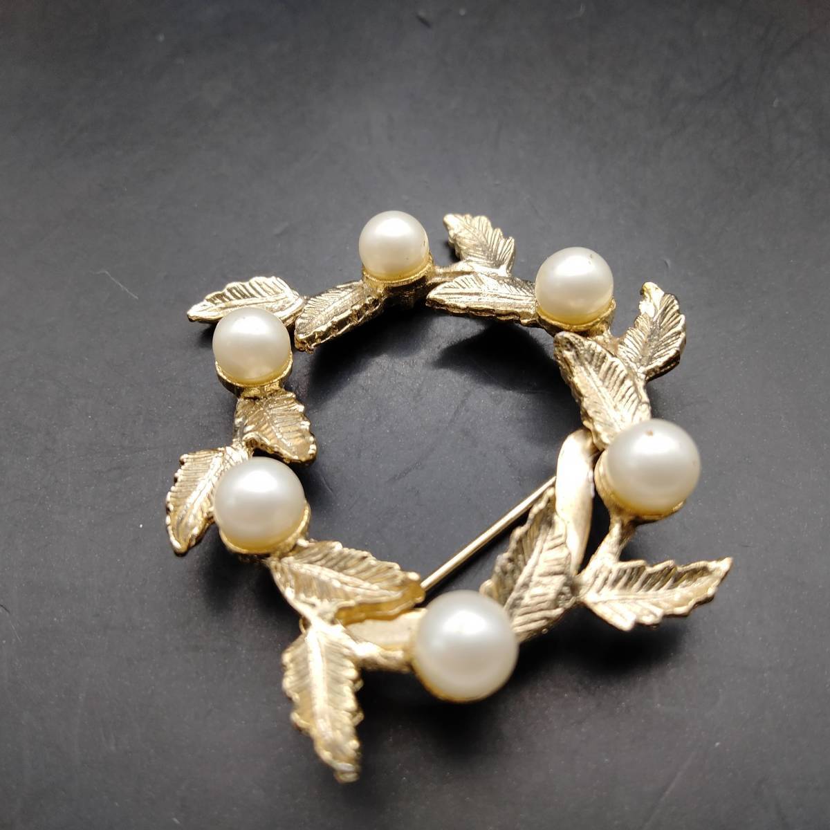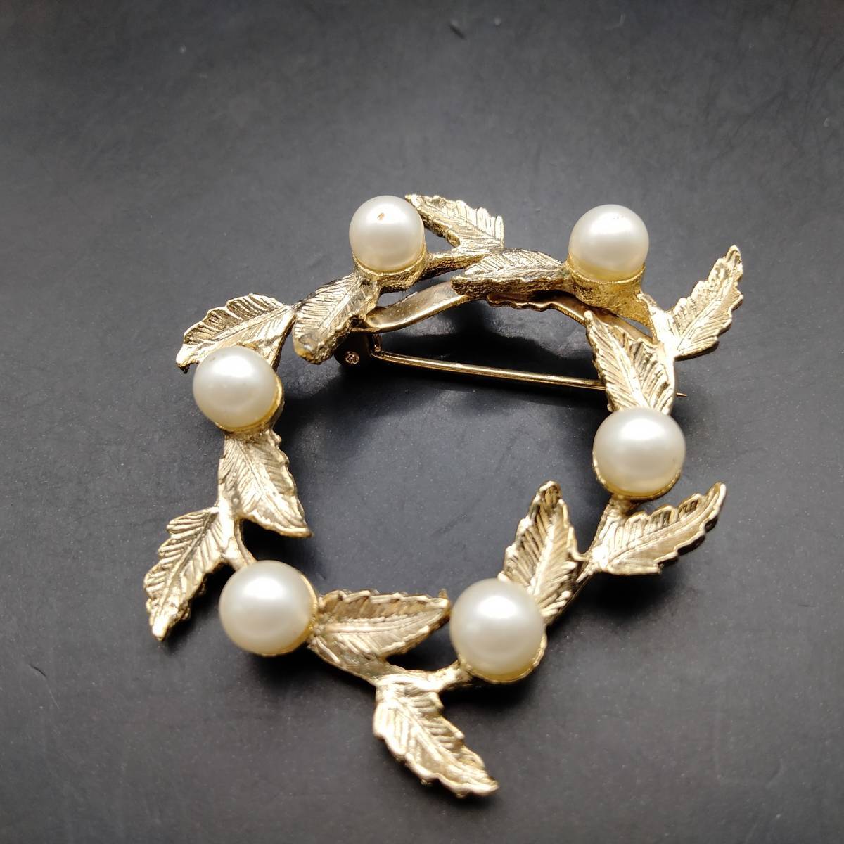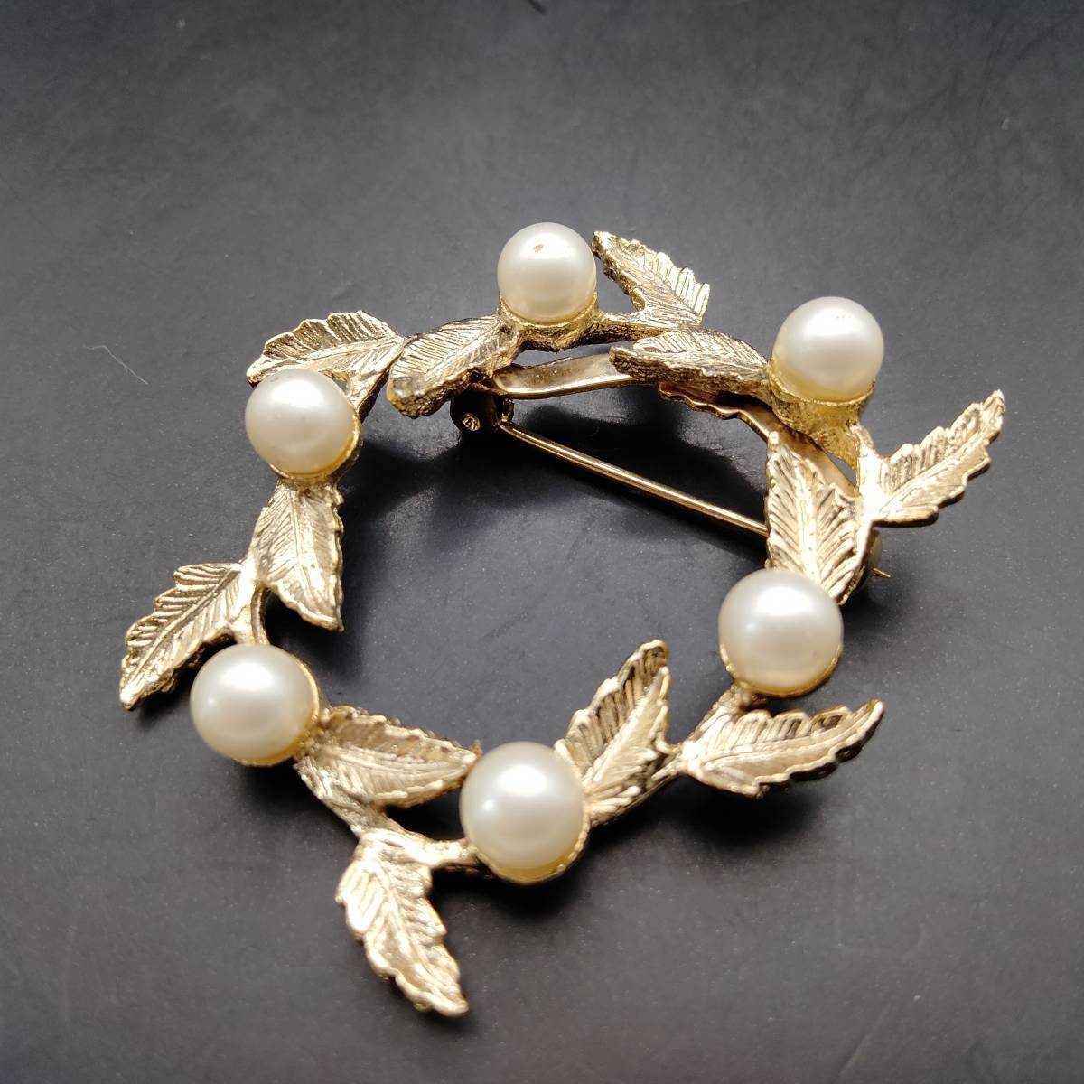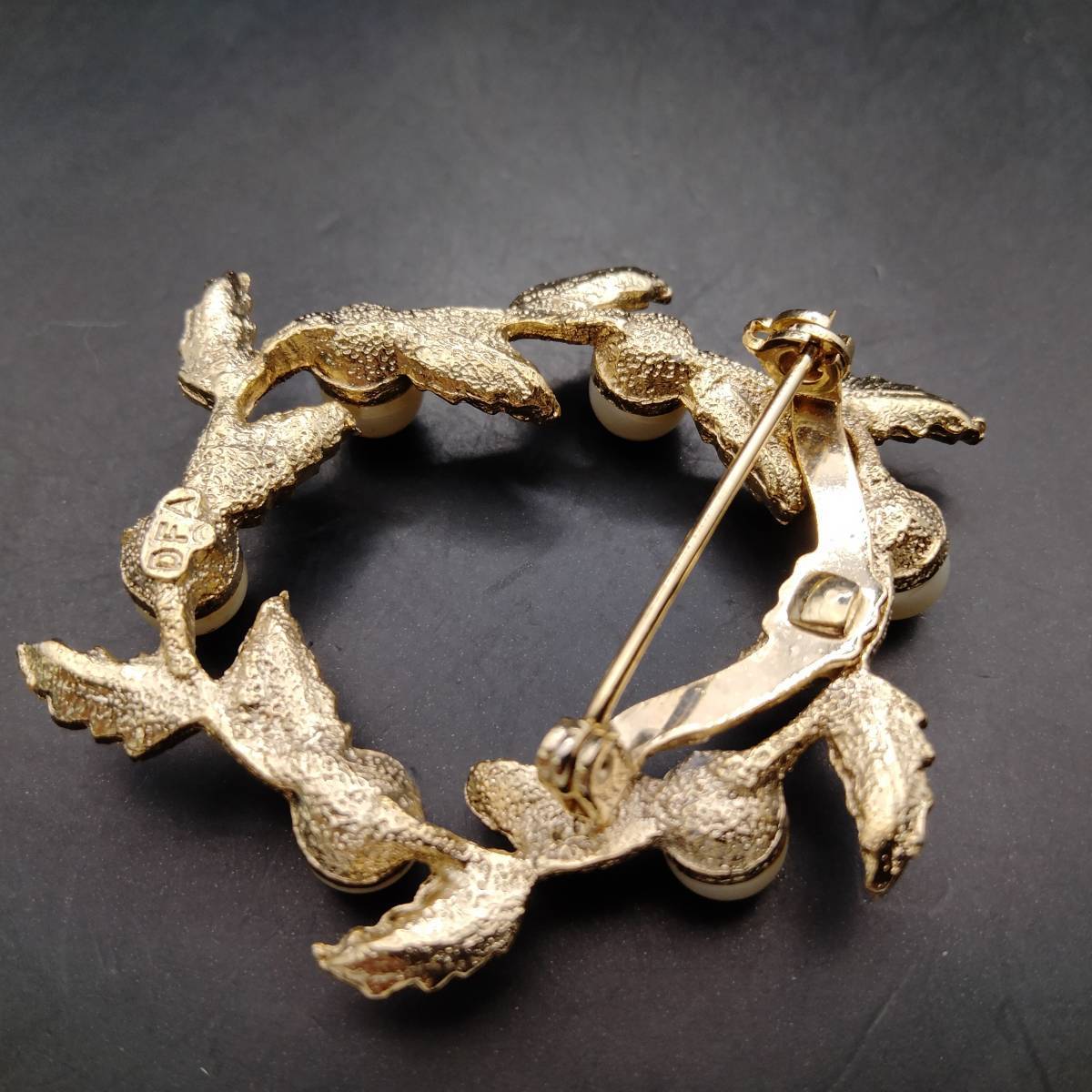 DFA リース 葉 モチーフ ホワイト フェイク パール ゴールドトーン ビンテージ ブローチ コスチューム ジュエリー 輸入 9S-J