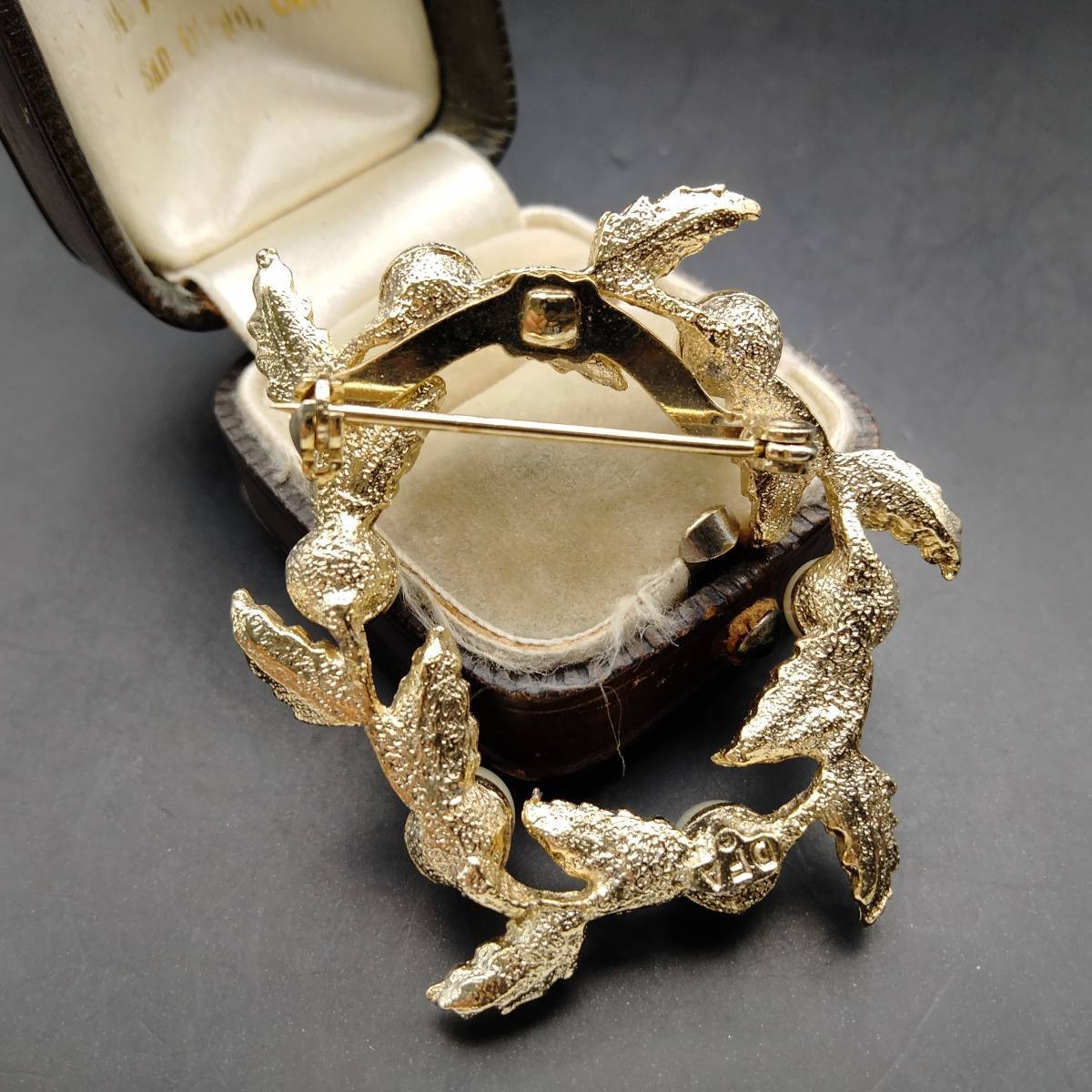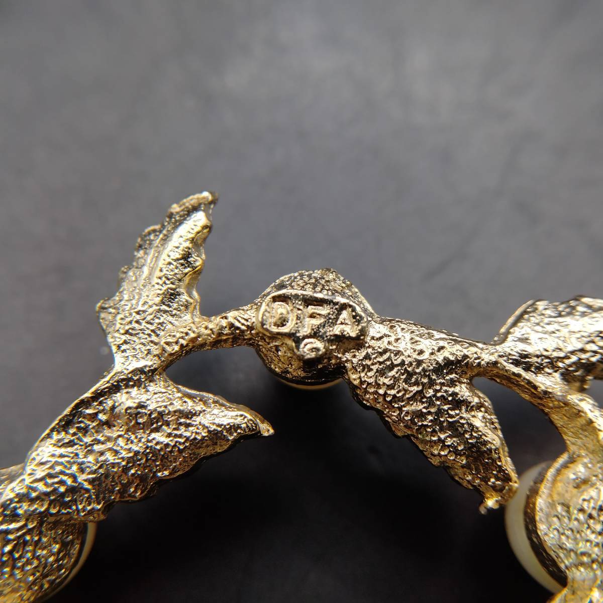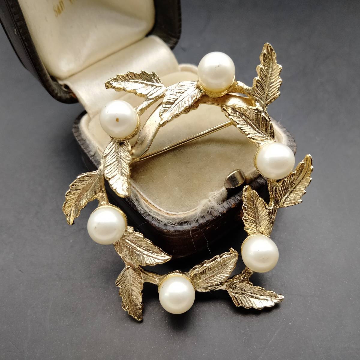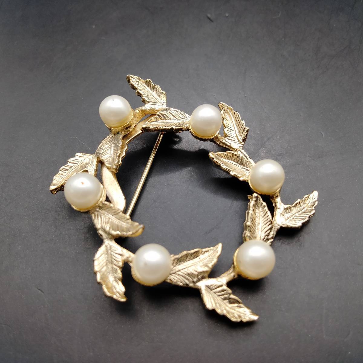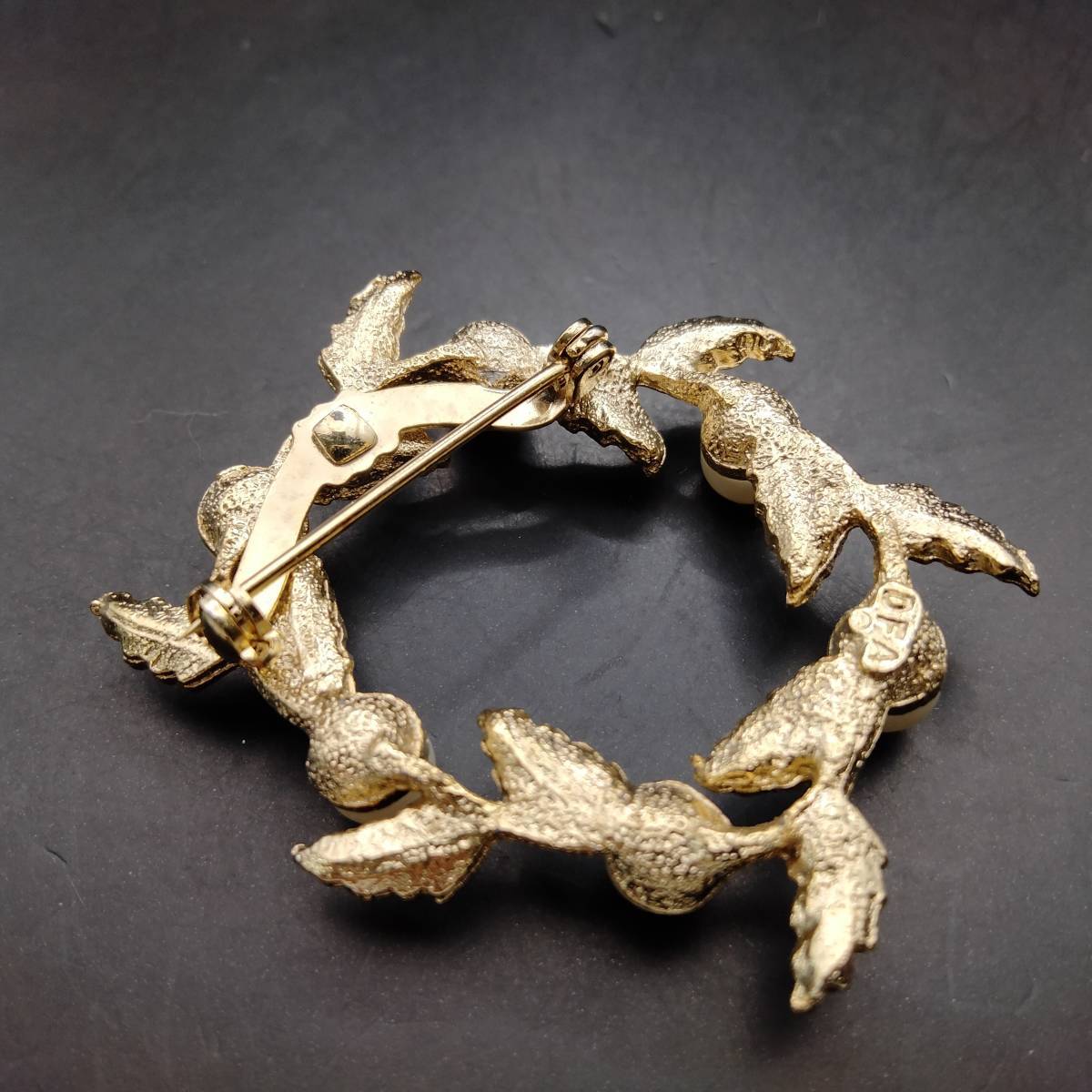 DFA リース 葉 モチーフ ホワイト フェイク パール ゴールドトーン ビンテージ ブローチ コスチューム ジュエリー 輸入 9S-J