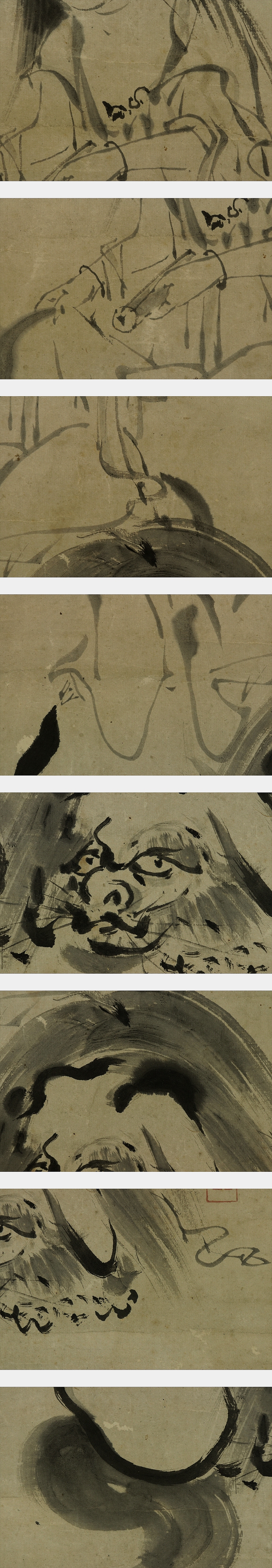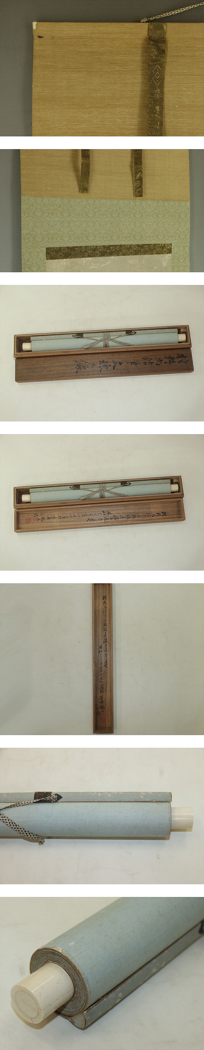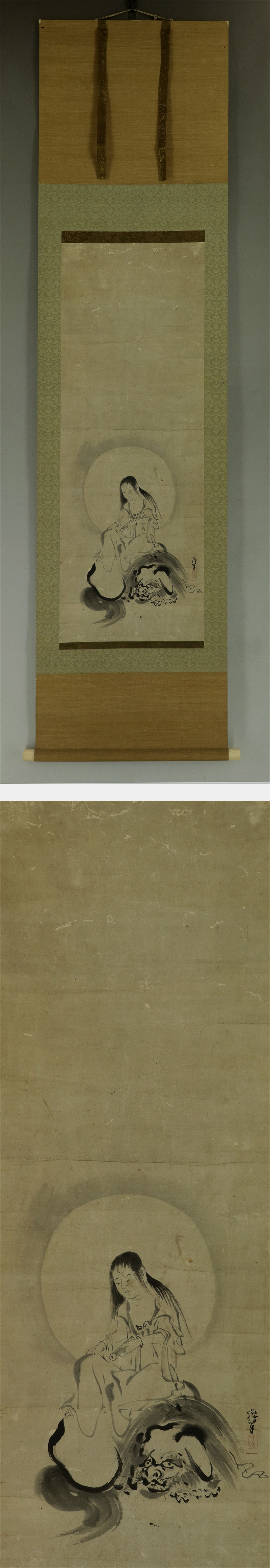狩野尚信 かのう-なおのぶ (1607-1650) 江戸時代前期の画家。 慶長12年10月6日生まれ。狩野孝信の次男。父の跡をつぐ。 寛永7年(1630)江戸にでて幕府奥絵師となり, 木挽(こびき)町狩野家をひらく。二条城,御所などの障壁画制作に参加した。 慶安3年4月7日死去。44歳。京都出身。通称は主馬(しゅめ)。号は自適斎。 本紙は、染み、汚れ、強い折れ、皺、虫食、破れ、剥がれがあります。 表装は、染み、汚れ、軽い折れ、皺、虫食、破れ、ほつれ、軸先に傷みがあります。 【サイズ】 作品 横約35cm×縦約99cm 表装 横約46.5cm×縦約183cm |