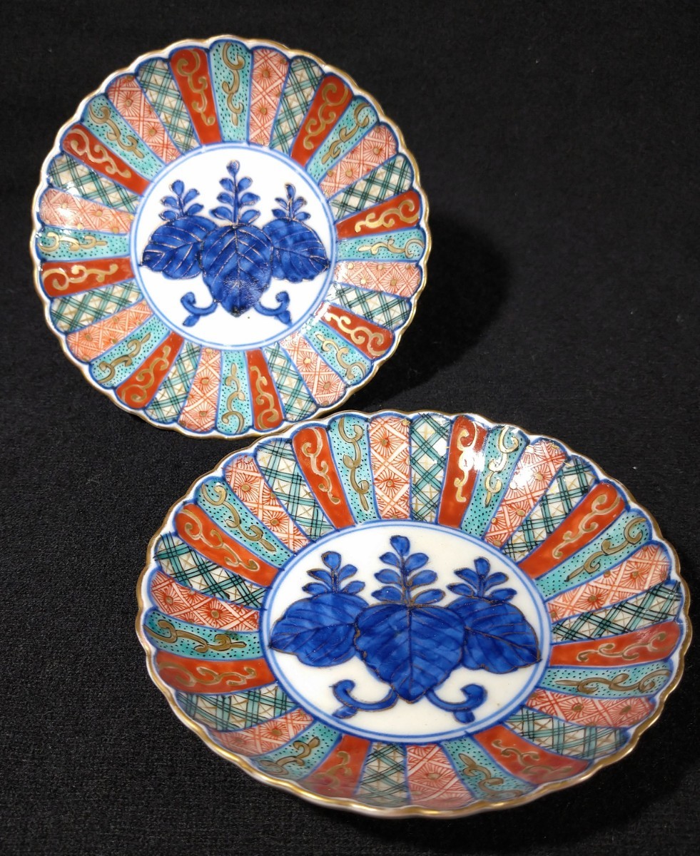 幾何学文に彩られた桐文が目を惹く美しい輪花皿2客組でございます。素人採寸で申し訳ございませんが、径11.1cm、高さ2.5cmでございます。