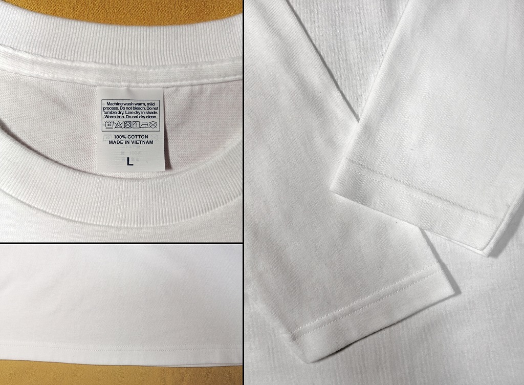 サンプル写真はすべてLサイズになります。ベースのTシャツはセットインスリーブ、5.6オンス(丸胴仕様)で品質と適度の厚さを備えたアメリカンタイプのレギュラーシルエットTシャツを使用しています。