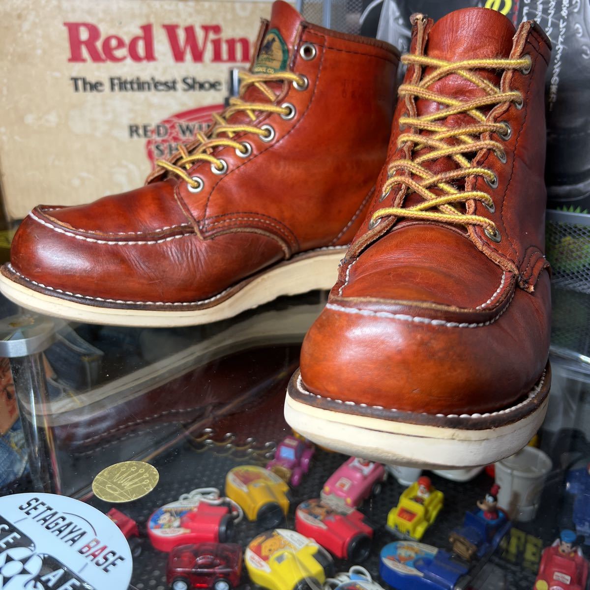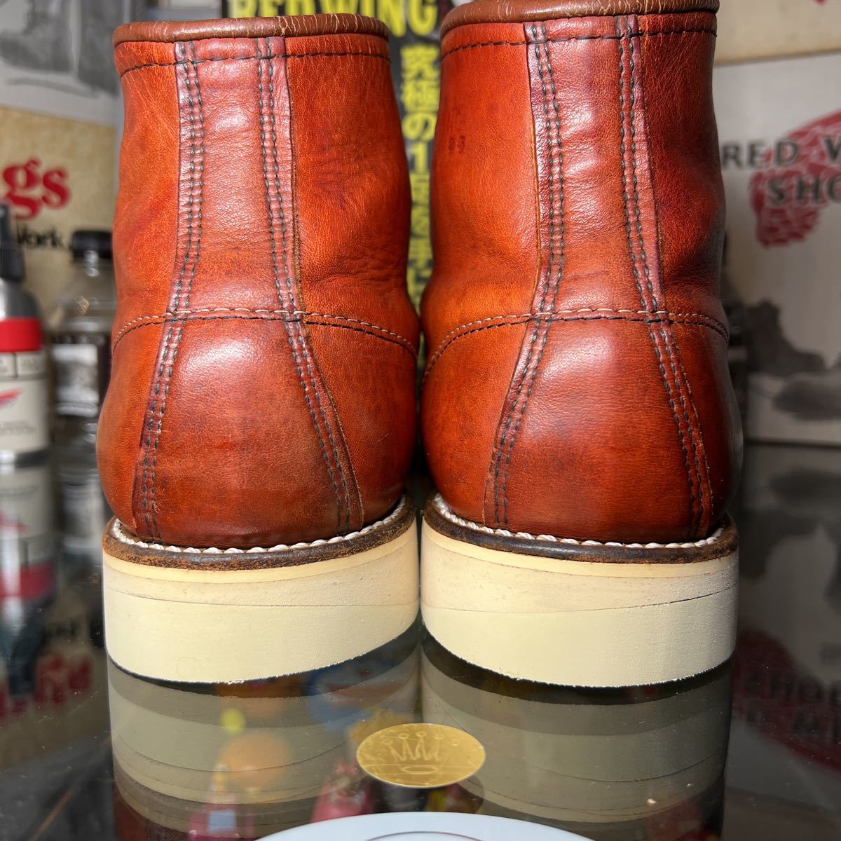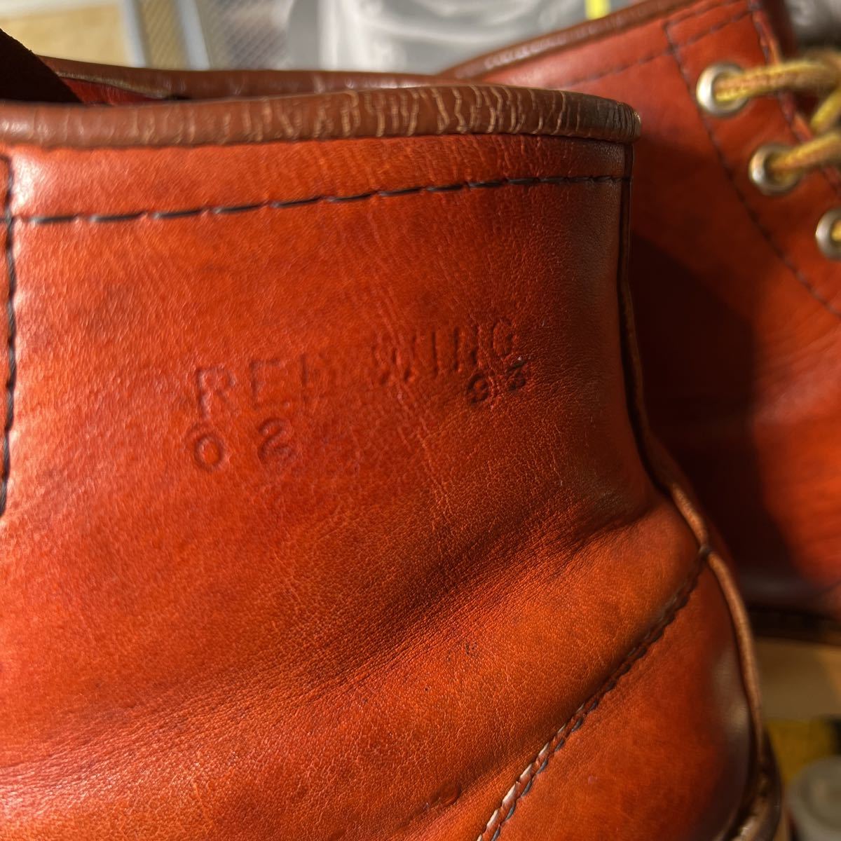 当商品は非常に人気のある90'sに生産された、独特の赤茶色が特徴のレッドウィング です。しかも右足タンの表に半円角犬タグが刺繍された超生産量の少ないモデルになります。