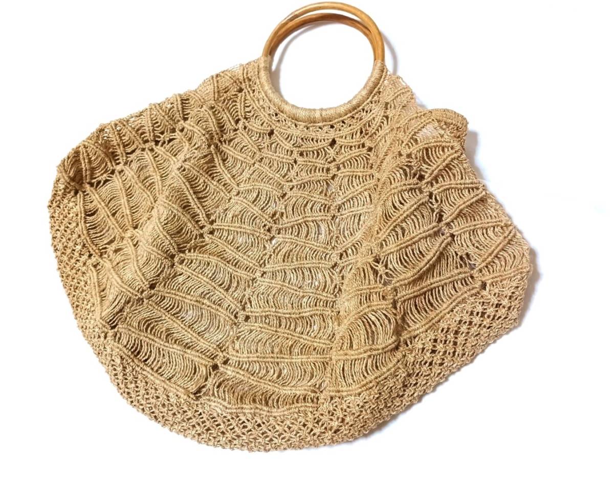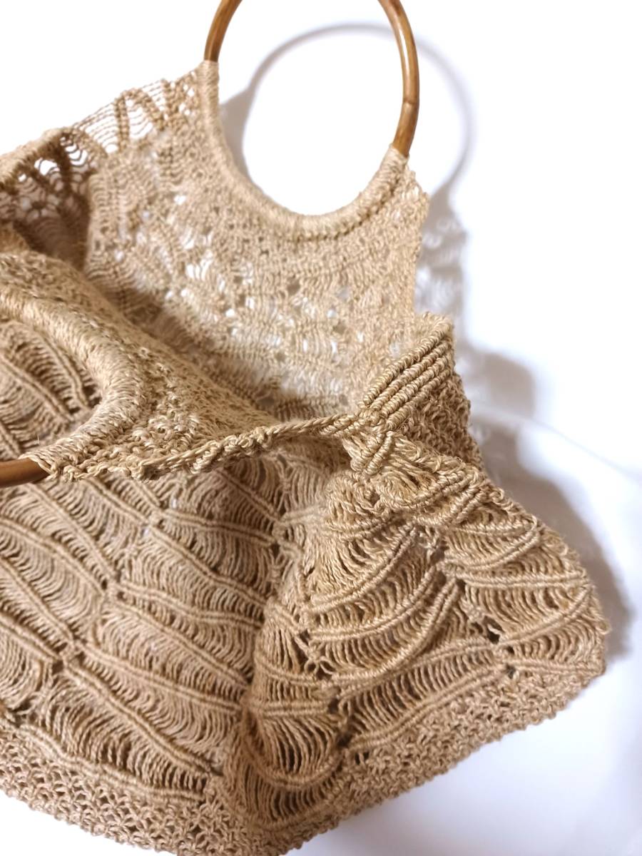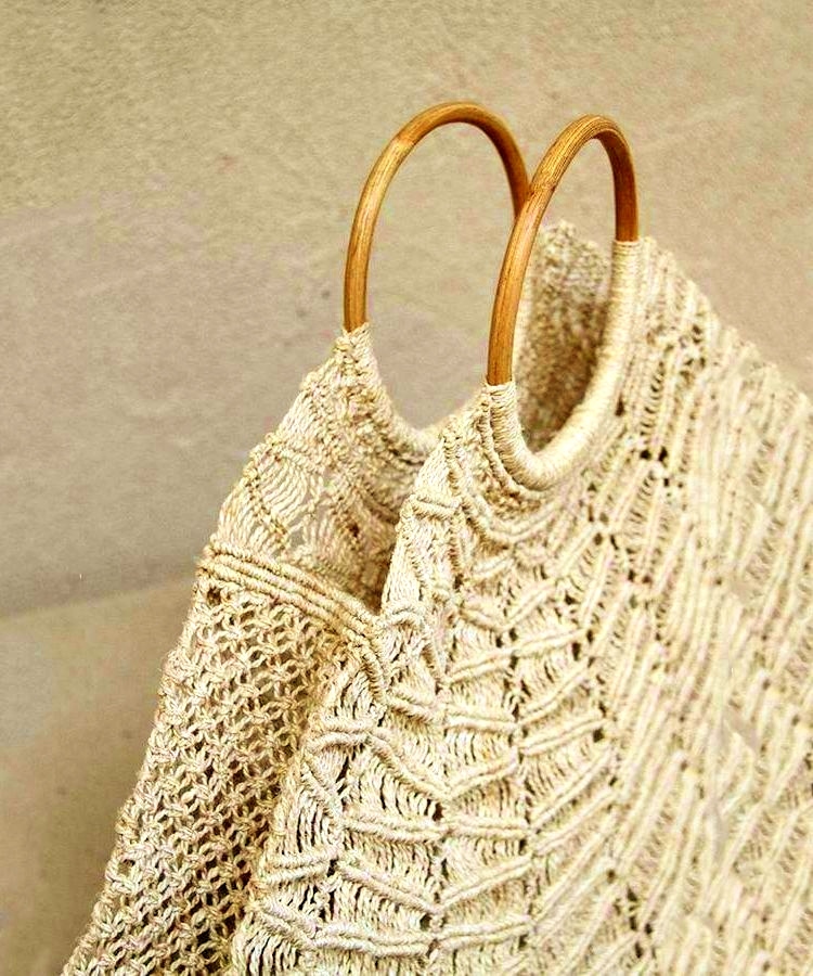 サイトより...手織りの天然ジュートマクラメと竹のリングハンドルを組み合わせた、70年代のビンテージスタイルのバッグ。