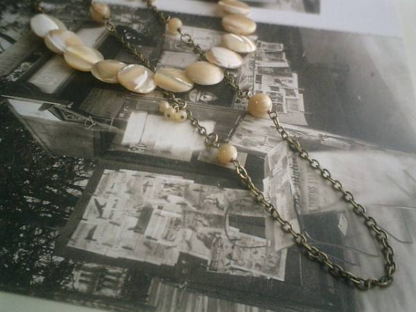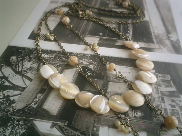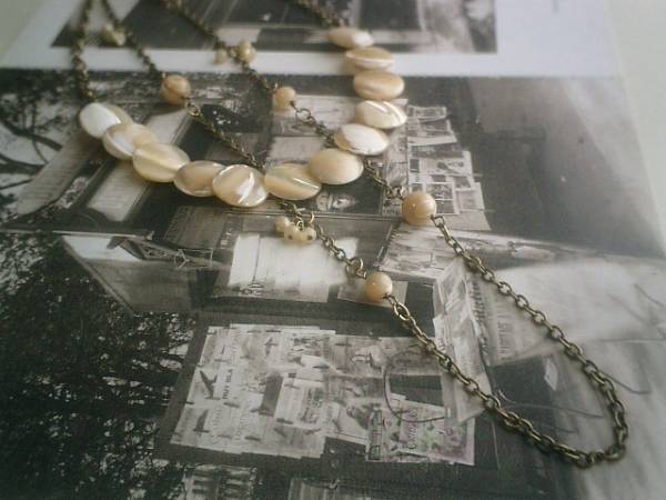 イノセントなパターン・・シリーズです♪幸せの予感・・シックなマザーオブパールのネックレス2本セットです♪短い方のネックレスは15ミリくらいのベージュ色のマザーオブパールのコインです♪アンティークチェーンを合わせてクラシカル・モダンな表情です♪長さは全長56センチ位で調節自由です♪チョーカー風に着けられても素敵です♪長い方のネックレスは4ミリ、6ミリ、8ミリの丸玉のマザーオブパールをランダムに繋いでキュートな表情です♪長さは84センチ+アジャスター12センチで全長96センチ位です♪2連にされても可愛いです♪それぞれ単品でも出品しています♪お揃いのブレスレットやピアスも出品しています♪♪シンプルで飽きのこないいつまでも着けられるデザインを考えて作りました!ハンドメイドをご理解頂いてノークレーム、ノーリターンでお願いします
