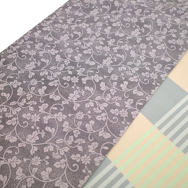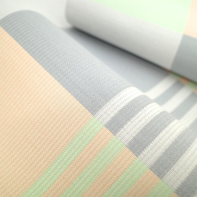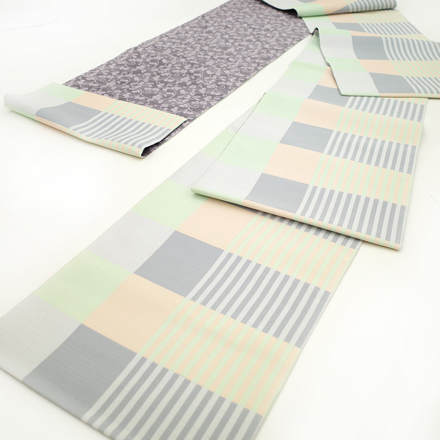 いずれも淡い サーモンオレンジ・黄緑・グレーで変わり格子が織り上げられています。