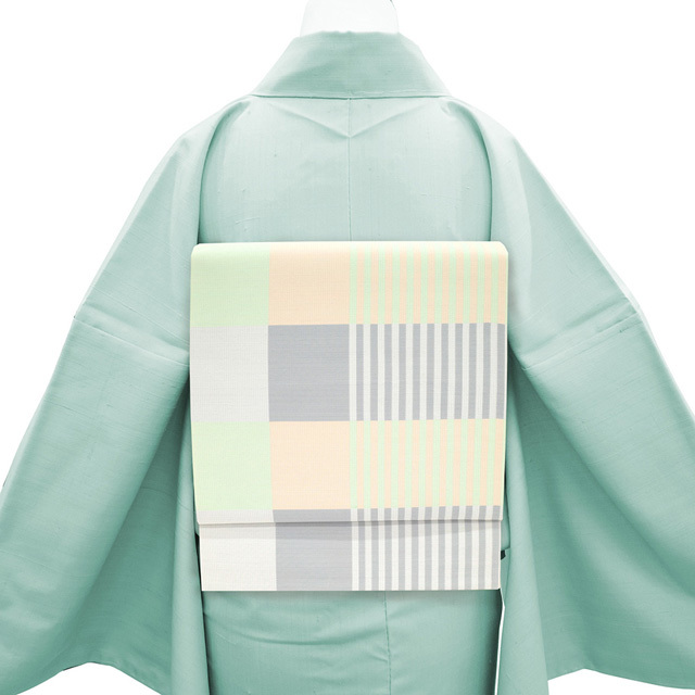袋帯 京都 西陣 全通 正絹 パステルカラー サーモンオレンジ 黄緑 グレー 変わり格子 カジュアル 新品 仕立て上がり みやがわ sb51521