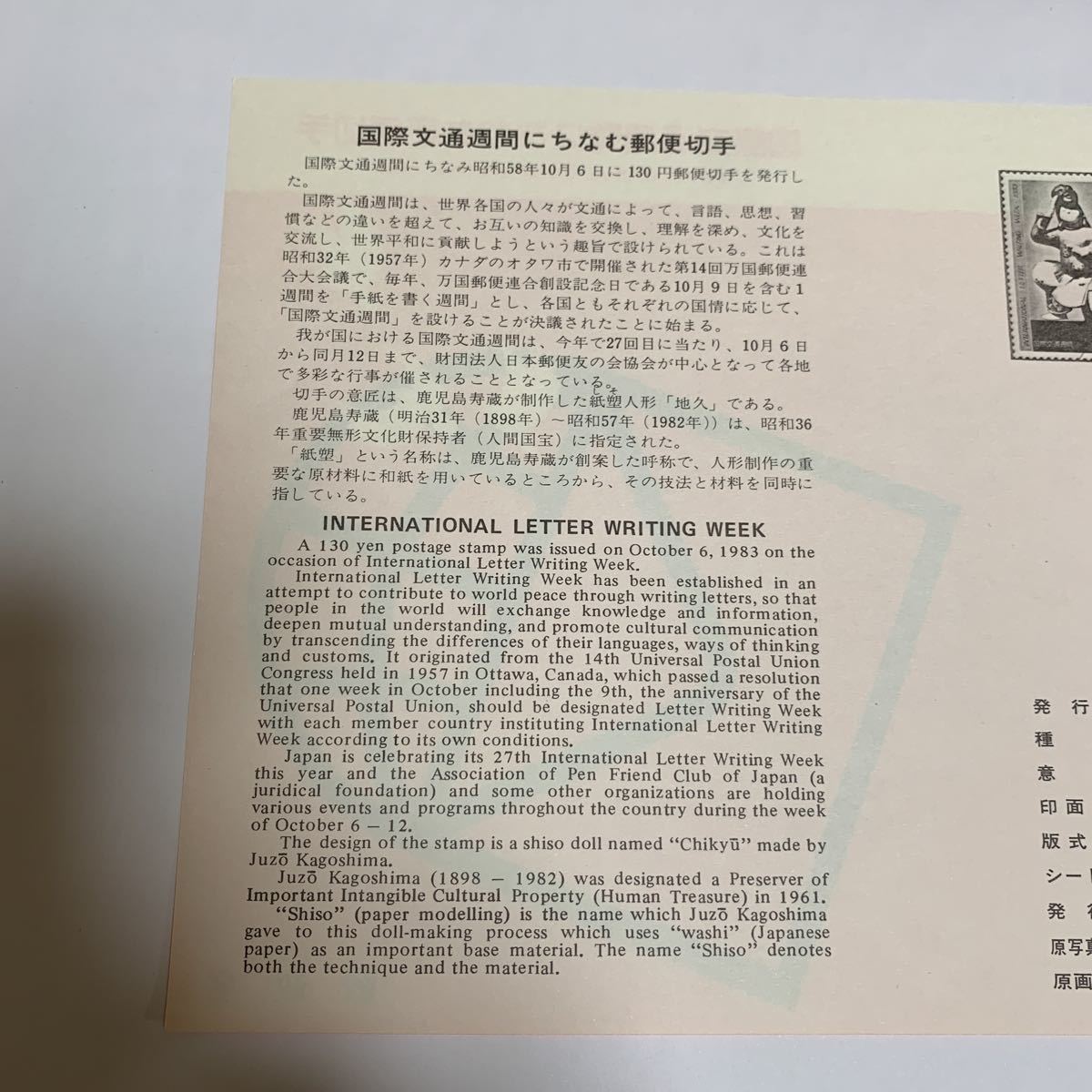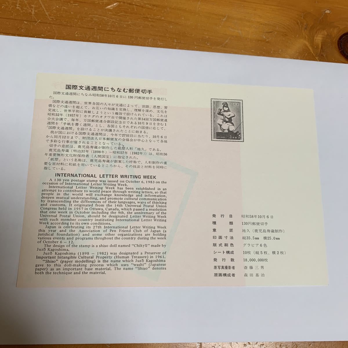 リーフレット 切手なし 1983年 郵政省 国際文通週間にちなむ郵便切手 昭和58年10月6日 地久 (鹿見島寿藏制作) レア 希少 非売品 美品 送料無料の出品です。 サイズ横21.1センチ縦15センチ 納戸の整理(断捨離)で今後使用予定が ない為出品しました。 衣装ケースに入れて保管してました。