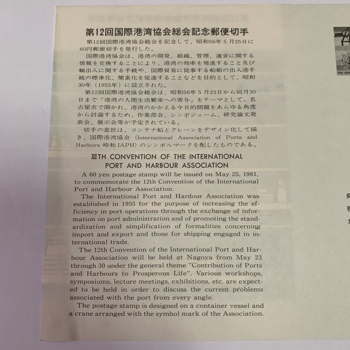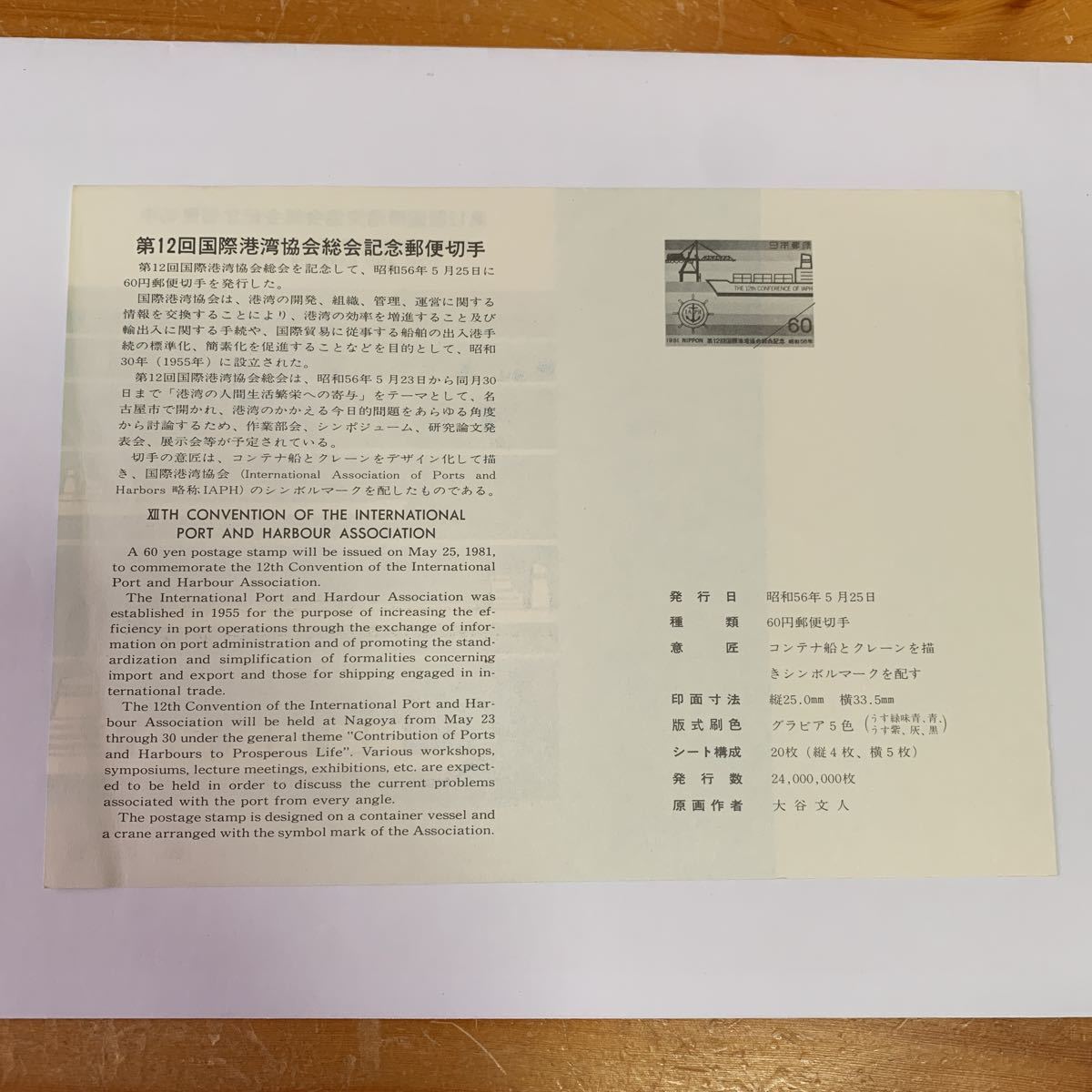 リーフレット 切手なし 1981年 郵政省 第12回国際港湾協会総会記念郵便切手 昭和56年5月25日 コンテナ船とクレーンを描きシンボルマークを配す レア 希少 非売品 美品 送料無料の出品です。 サイズ横21.1センチ縦15センチ 納戸の整理(断捨離)で今後使用予定が ない為出品しました。 衣装ケースに入れて保管してました。