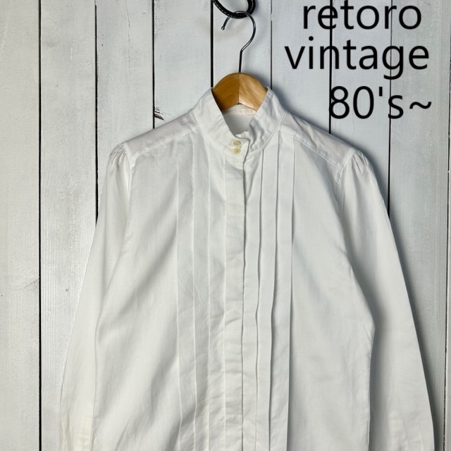 sh●624 レトロ古着 80s~90s 東京ブラウス バンドカラー比翼タックブラウス シャツ B82 白 ヴィンテージ コットン 長袖 ドレスブラウス