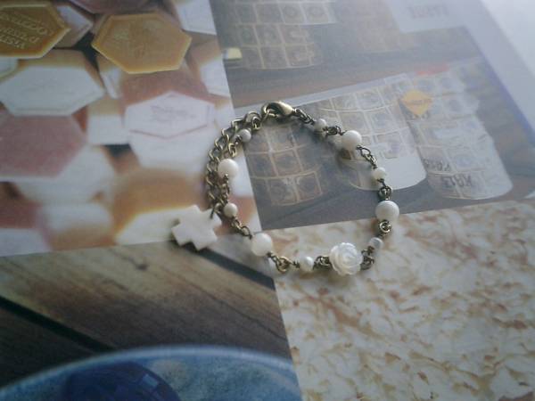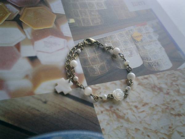 愛しいお気に入り・・シリーズです♪初夏の訪れ・・シックなマザーオブパールの薔薇のブレスレットです♪♪3ミリと6ミリ位の丸玉、10ミリの薔薇のマザーオブパールのブレスレットはオフホワイトでまとめて可憐な表情です♪長さは全長23センチ位で調節自由です♪♪お揃いのブレスレットやネックレスも出品しています♪シンプルで飽きのこないいつまでも着けられるデザインを考えて作りました!ハンドメイドをご理解頂いてノークレーム、ノーリターンでお願いします