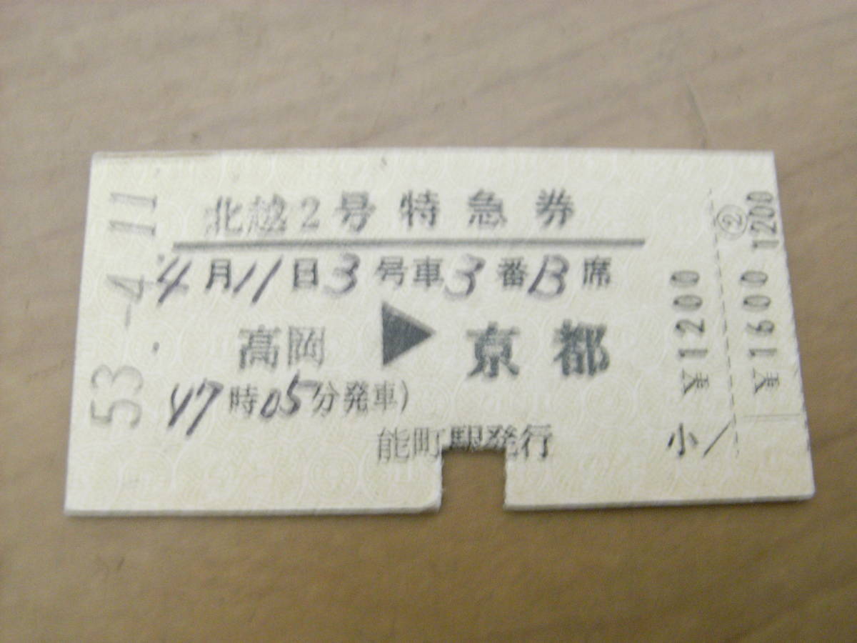 北越2号 特急券 高岡→京都 昭和53年4月11日発行 (氷見線)能町駅発行