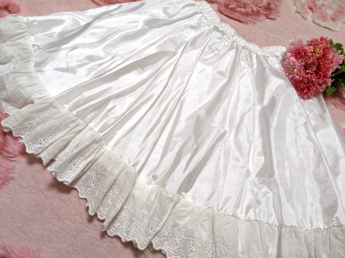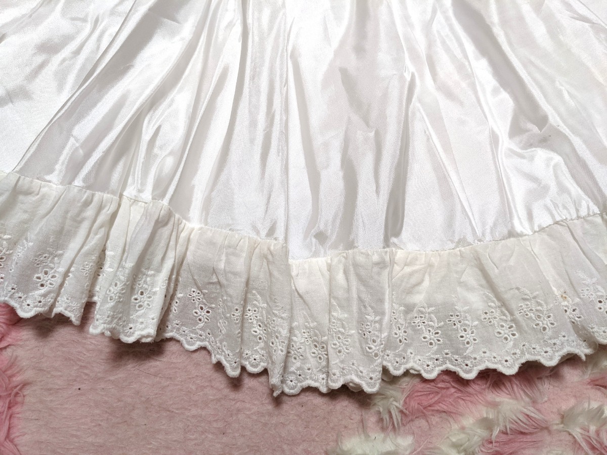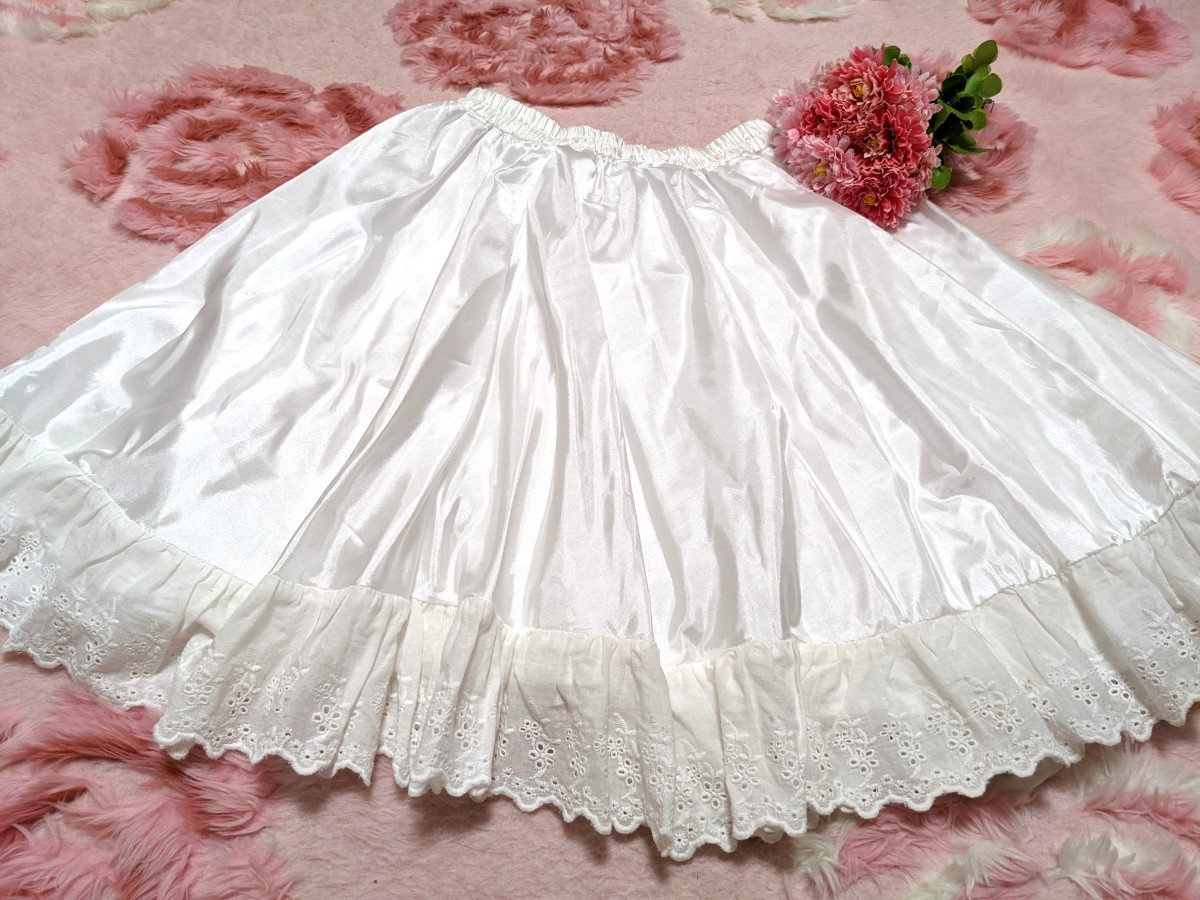 色は純白で手触りツルツルの光沢素材で裾には可愛らしい花柄レースフリルが沢山ついてます!