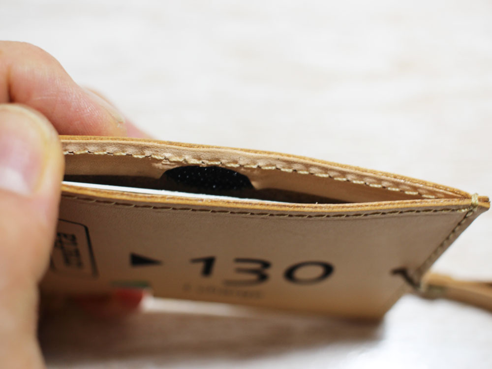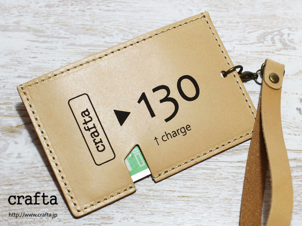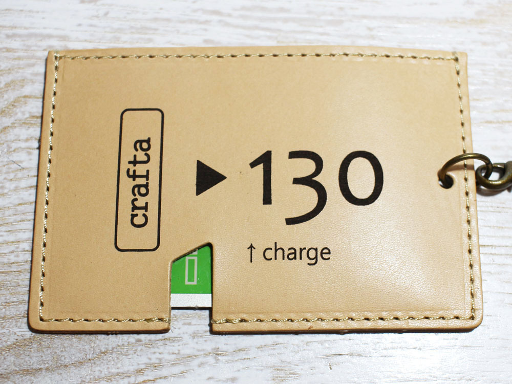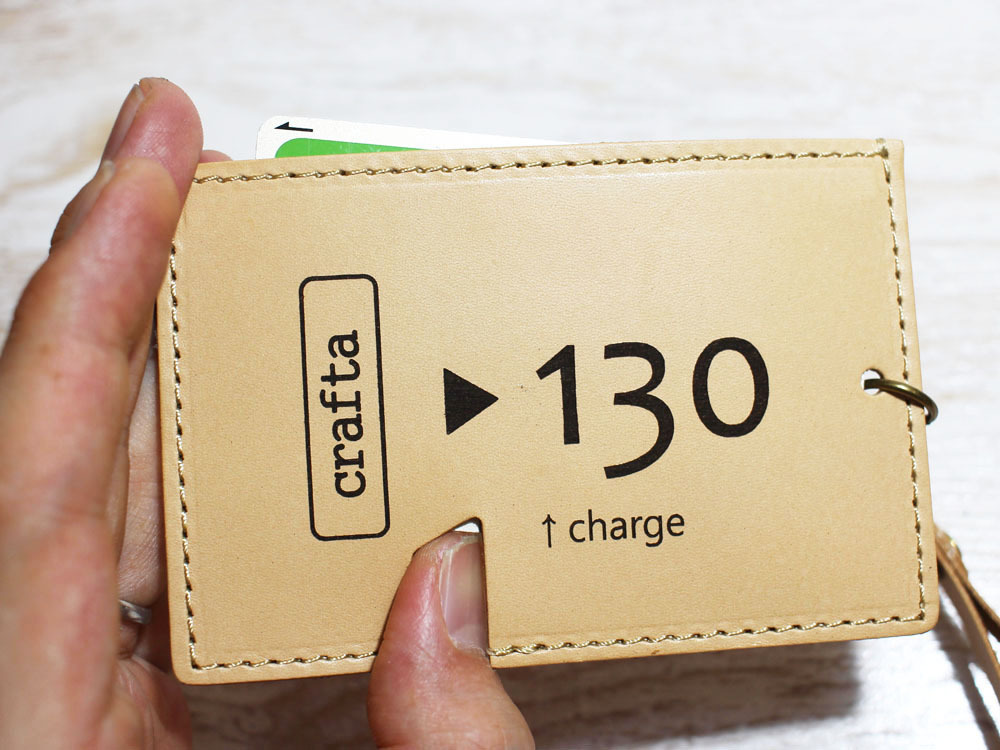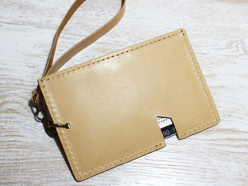 味わいのある牛ヌメ革を使い、「昔の切符」をモチーフにパスケースを作製しました。切符の図案はレーザー刻印で入れています。名前の「s-kip」は「スマート切符」の略です(笑)昔の切符で改札タッチ、というオツな一品です。同じ革で作ったストラップも付属します。チャージ等でカードを取り出す際は切符の「ハサミ」部分から指で押し上げることで、取り出しやすくなっています(写真2参照)。内側にはカード脱落防止のため小さいマジックテープを縫い込んでいます。簡易的なストラップつきです。