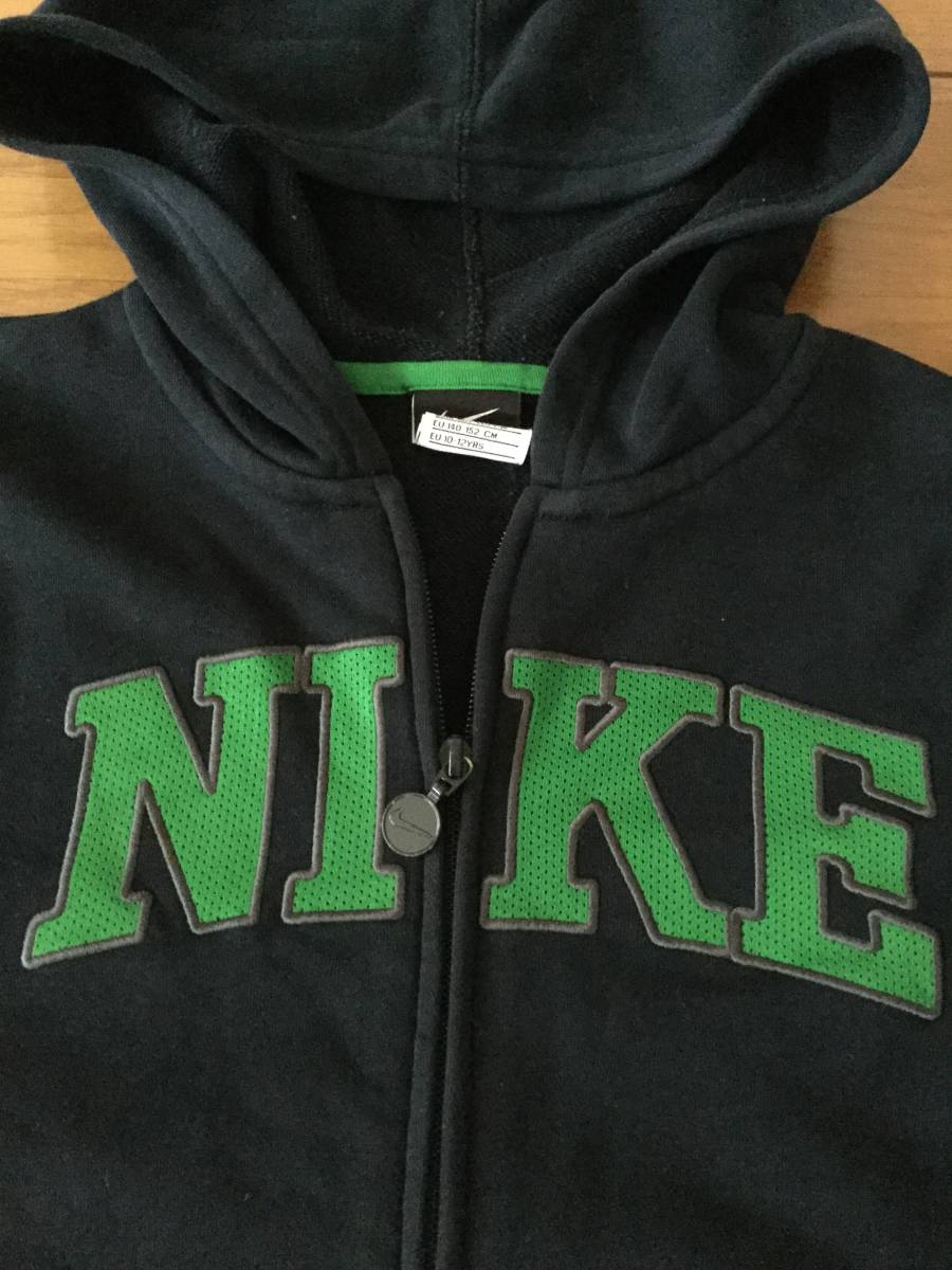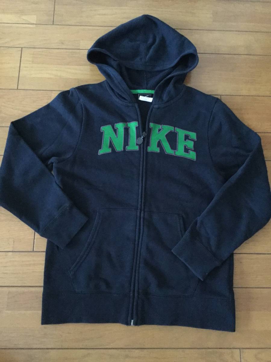 美品子供用NIKEナイキ紺色パーカーM(140〜152)。着丈55cm身幅44cm。10~12歳用。男女兼用。袖に点状に汚れあり、写真見てくださいね。