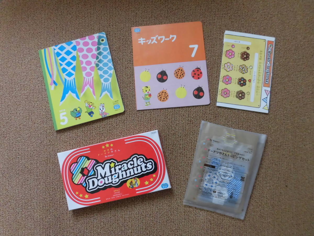 内容は5月号がチョコドーナツ5個・いちごドーナツ5個・トレイ・トング・かずカード(5枚)・おもちかえり箱2個・
