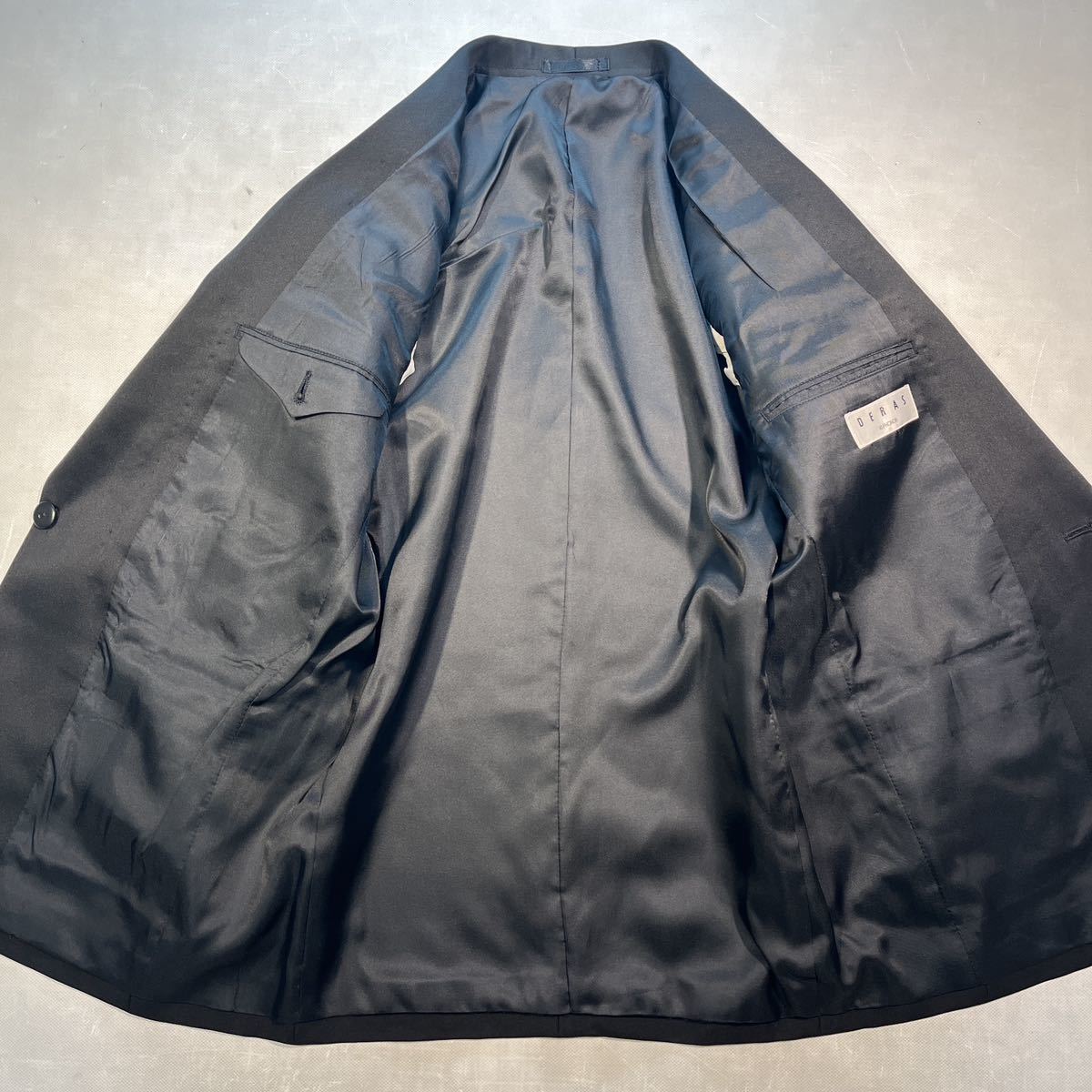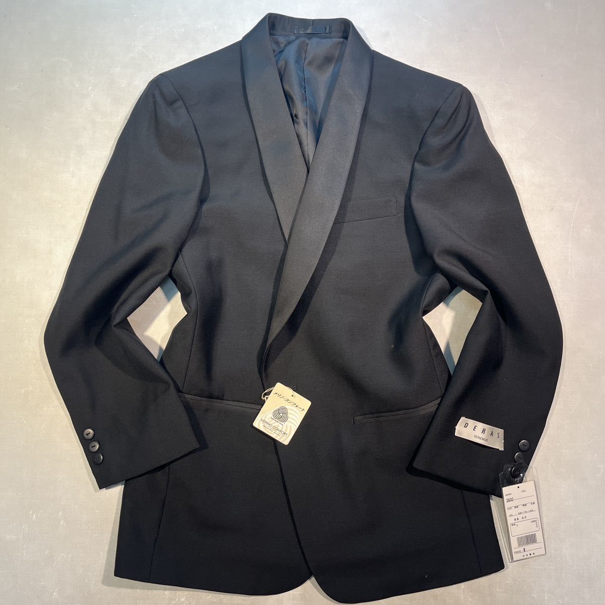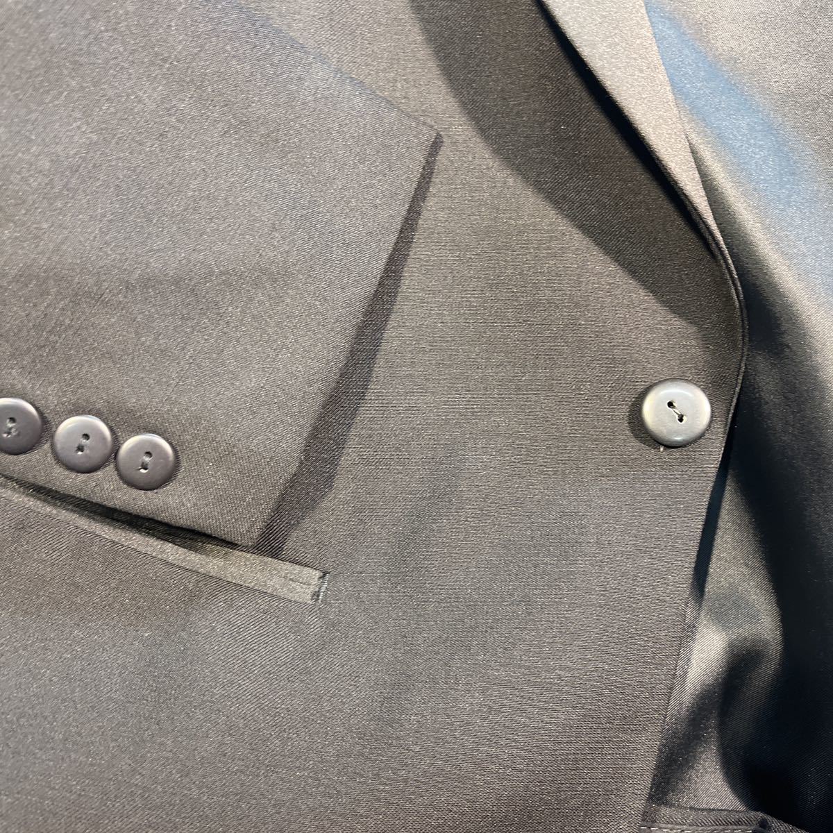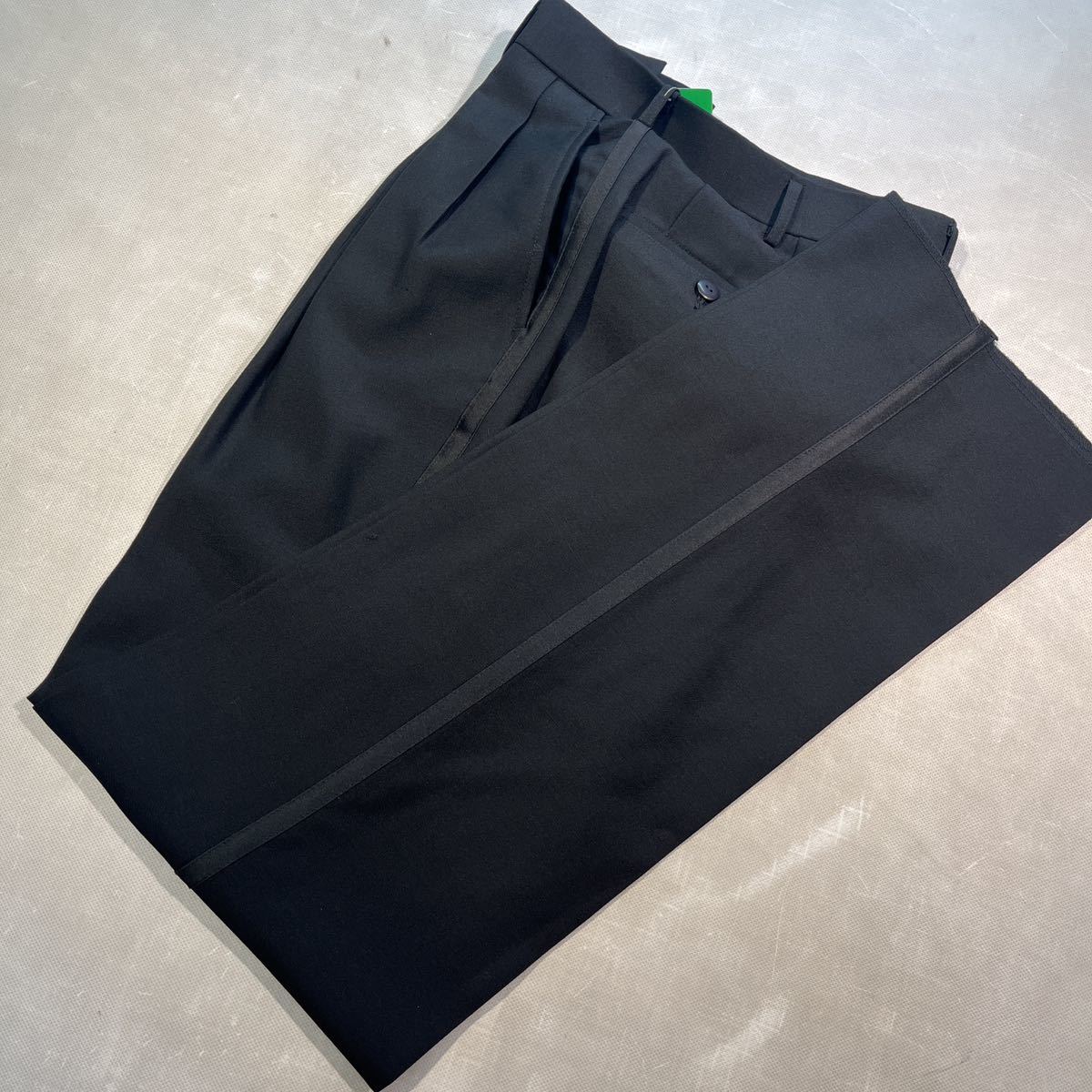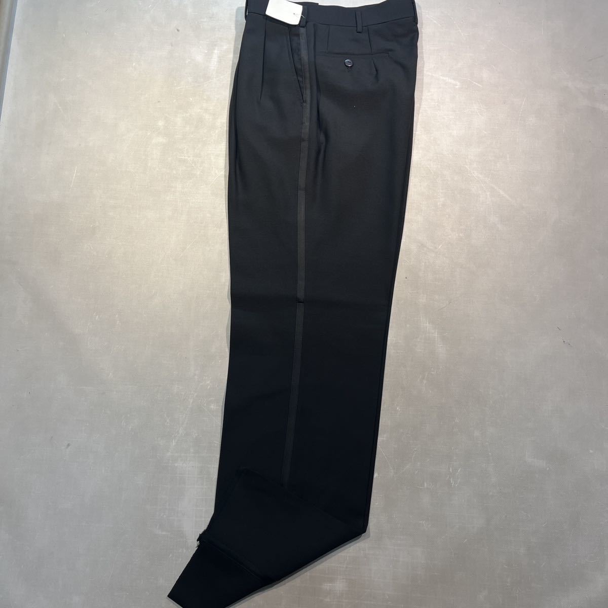 メリノウール100%使用の現在ではかなり希少なタキシードです。タキシードのパンツの側面に、1本のシルクのラインが入っています。基本的にタキシードはこのライン、側章(そくしょう)が入っているものとなり、側章有りが正式なものとなっております。こちらのお品ならどのようなパーティーや式典に着用してもカッコ良く仕上げてくれる最高の逸品。