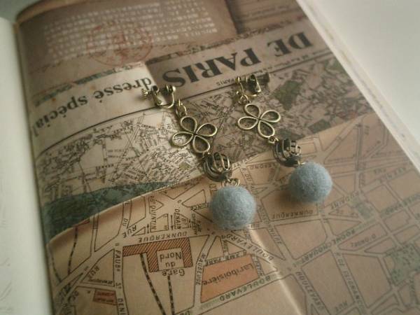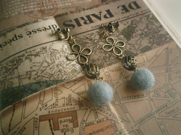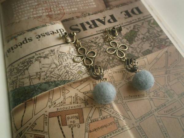 フラッパーガール・・シリーズです♪愛しい人・・ふんわりやさしいフェルト玉のイヤリングです♪ペア1組です♪シックなブルーグレーのフェルト玉は14ミリ位です♪キュートなクローバーなどデザイン違いのメタルチャームを合わせて可憐な表情です♪長さは全長8センチ位です♪ピアスにも変更出来ます♪お揃いのネックレスやブレスレットも出品しています♪シンプルで飽きのこないいつまでも着けられるデザインを考えて作りました!ハンドメイドをご理解頂いてノークレーム、ノーリターンでお願いします