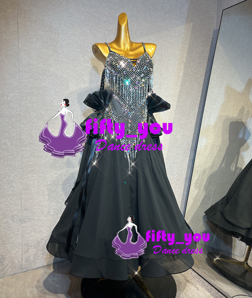 新品fifty_youレディース社交ダンス衣装 ワルツ競技試合デモ用ドレス モダン素敵ドレス サイズオーダー ライトストーン+ビーズ飾り 黒色