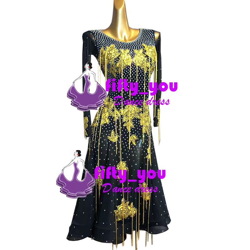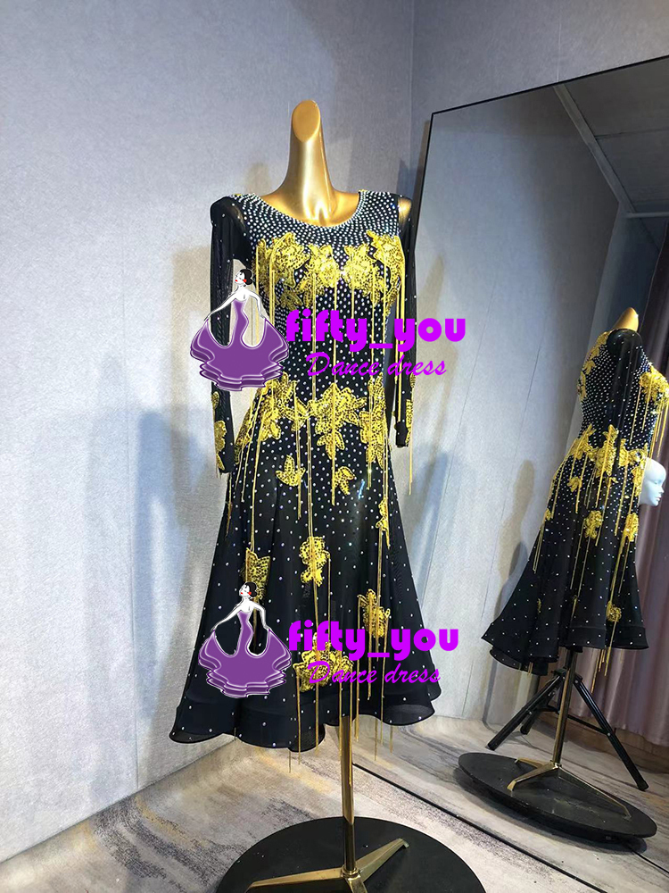 新品fifty_you レディース社交ダンス衣装 ラテンドレス 素敵モチーフ飾り セミオーダードレス ブラック 競技発表会デモ用 デザインA