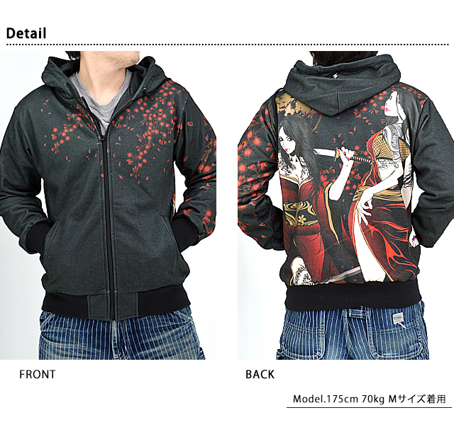 絡繰魂の姉妹ブランドとして誕生した、従来の和柄から抜け出し、和の持つ美しさを融合させた【抜刀娘】から「抜刀娘 娘達の闇夜パーカー(234867)」のご紹介です。 闇夜に佇む娘達を描いたジップパーカーが登場しました! 柄は2種類からお選び頂けます。 それぞれのボディーカラーに合わせてモチーフや色味に変化を持たせ、まったく異なる表情に。 着物や帯の柄まで細かく描き込みが施されているところは抜刀娘ならではです。 プリントで仕上げることで、軽い着心地を実現しました。 ボディーには、裏毛タイプのスウェット生地を採用。 | |||||||||||||||||||||||||