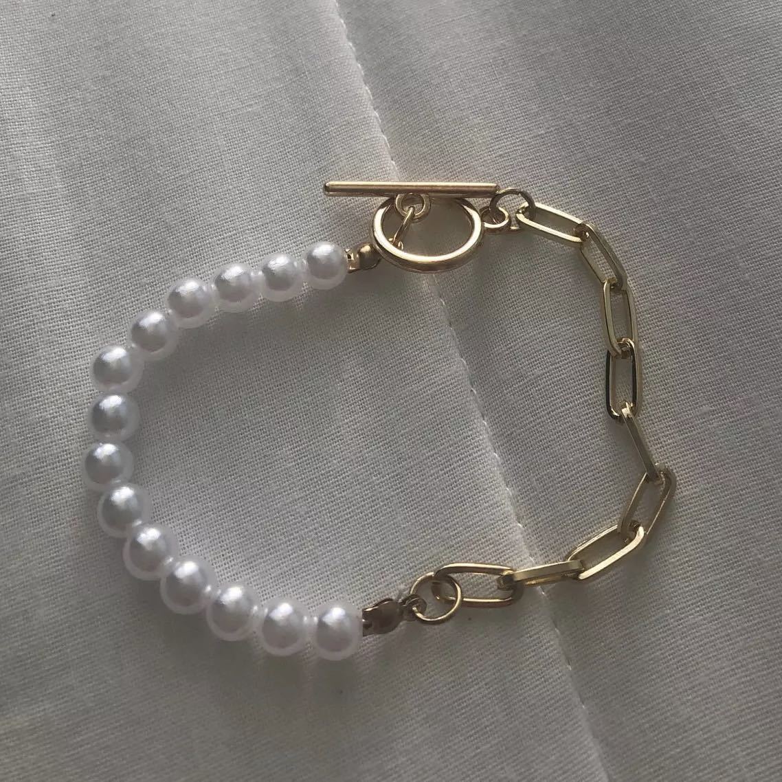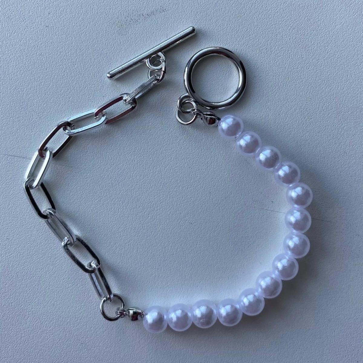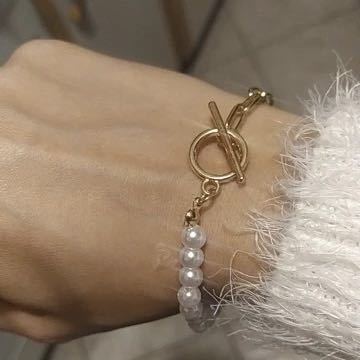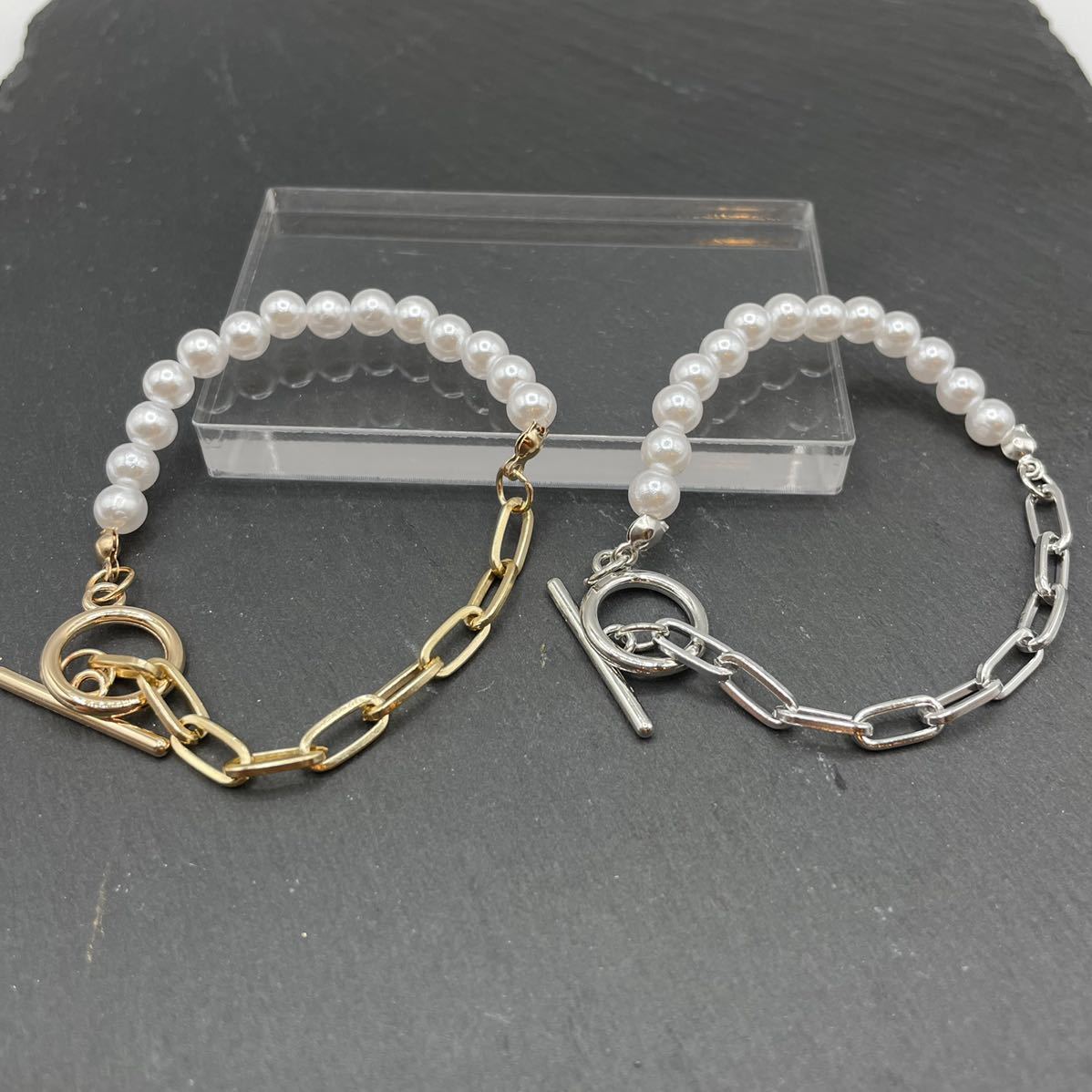 プラスチックパールとチェーンのコンビブレスレットになります^ ^