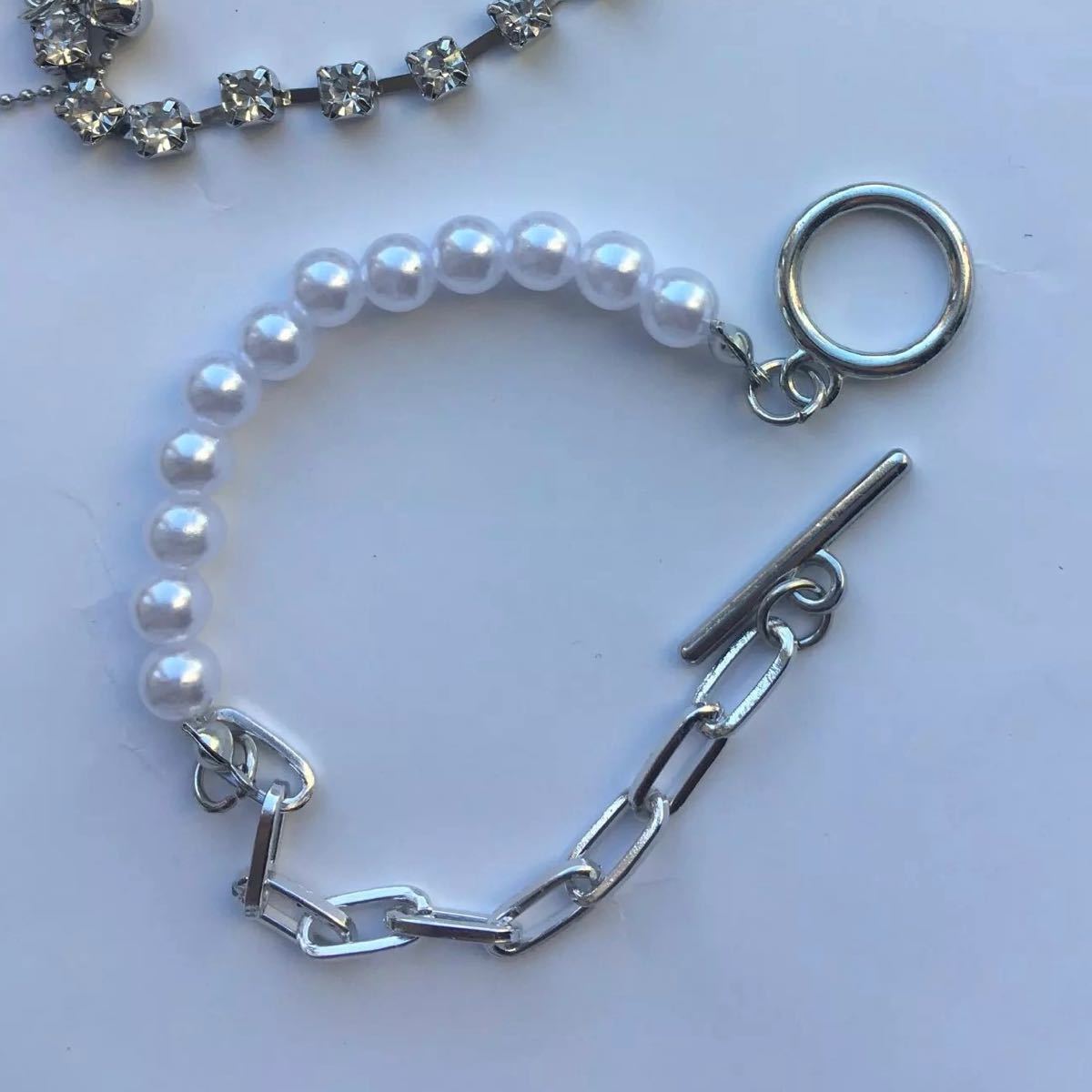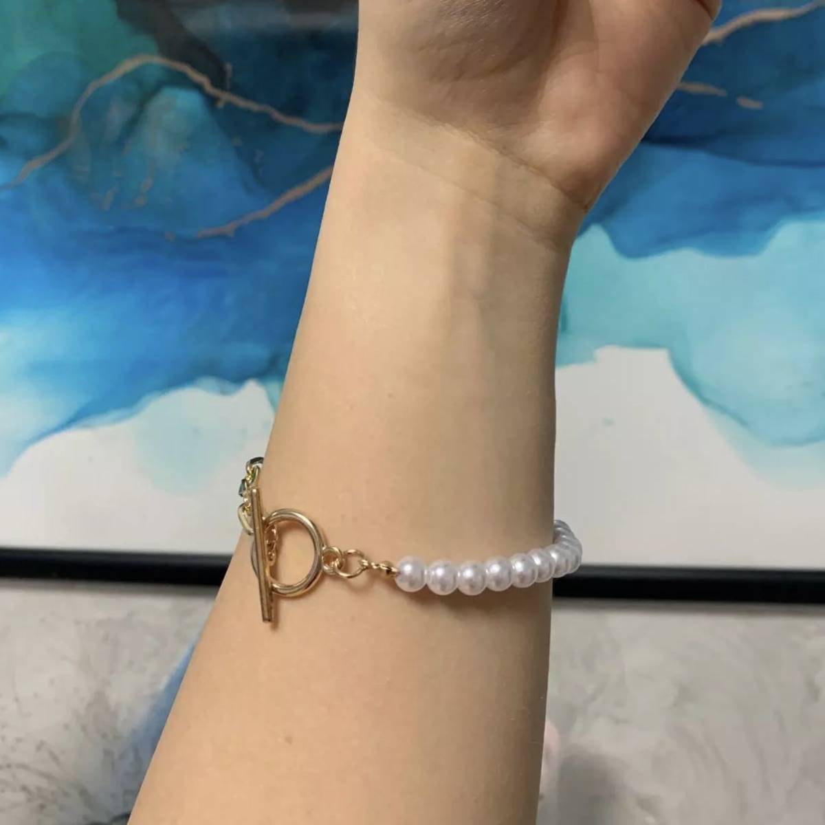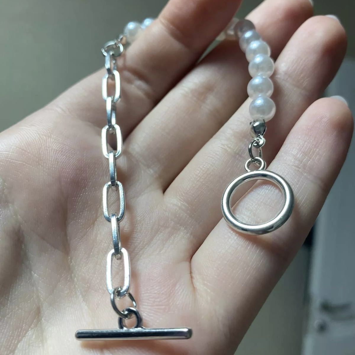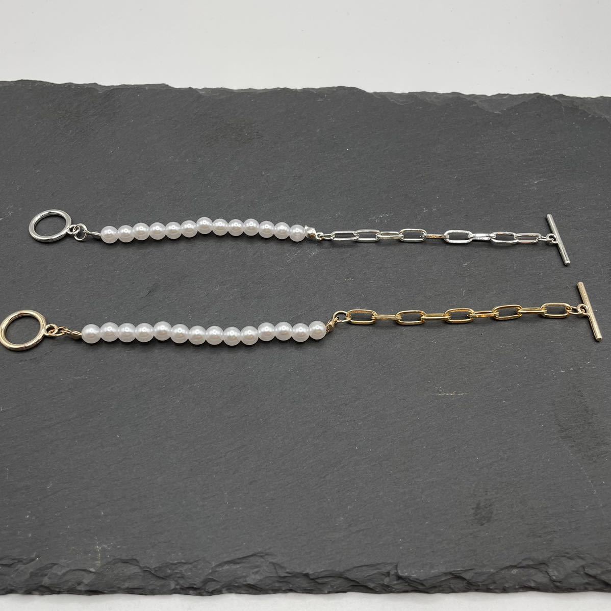 プラスチックパールとチェーンのコンビブレスレットになります^ ^