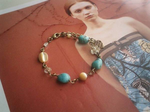 ガラスの靴の女の子・・シリーズです♪夏への移ろい・・シックなターコイズのブレスレットです♪ターコイズは10ミリから12ミリ位のタンブルです♪マザーオブパールの4ミリ、6ミリの丸玉、10×8ミリ位のオーバルやお花のチェコビーズやデザインビーズを合わせて爽やかな表情です♪長さは全長22センチ位で調節自由です♪お揃いのネックレスも出品しています♪シンプルで飽きのこないいつまでも着けられるデザインを考えて作りました!ハンドメイドをご理解いただいてノークレーム、ノーリターンでお願いします