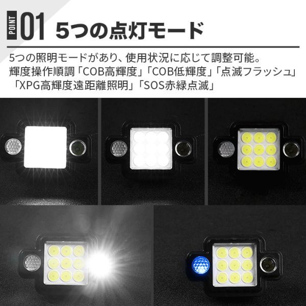 輝度操作順調:「COB高輝度」-「COB低輝度」-「点滅フラッシュ」-「XPG高輝度遠距離照明」-「SOS赤緑点滅」