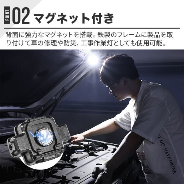 LEDヘットライトとして使えるだけでなく、背面に強力なマグネットを搭載し、取り外しが可能です。頭に被るだけでなく、鉄製のフレームに製品を取り付けて両手を解放することもできます。車の修理、防災、工事作業灯としても使えます。
