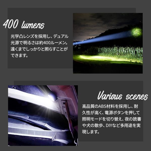 見た目は高品質のABS材料を採用し、耐久性が高く、電源ボタンを押して照明モードを切り替え可能です。夜の読書、犬の散歩、DIYなど多用途を実現します。