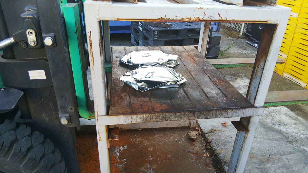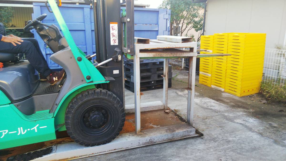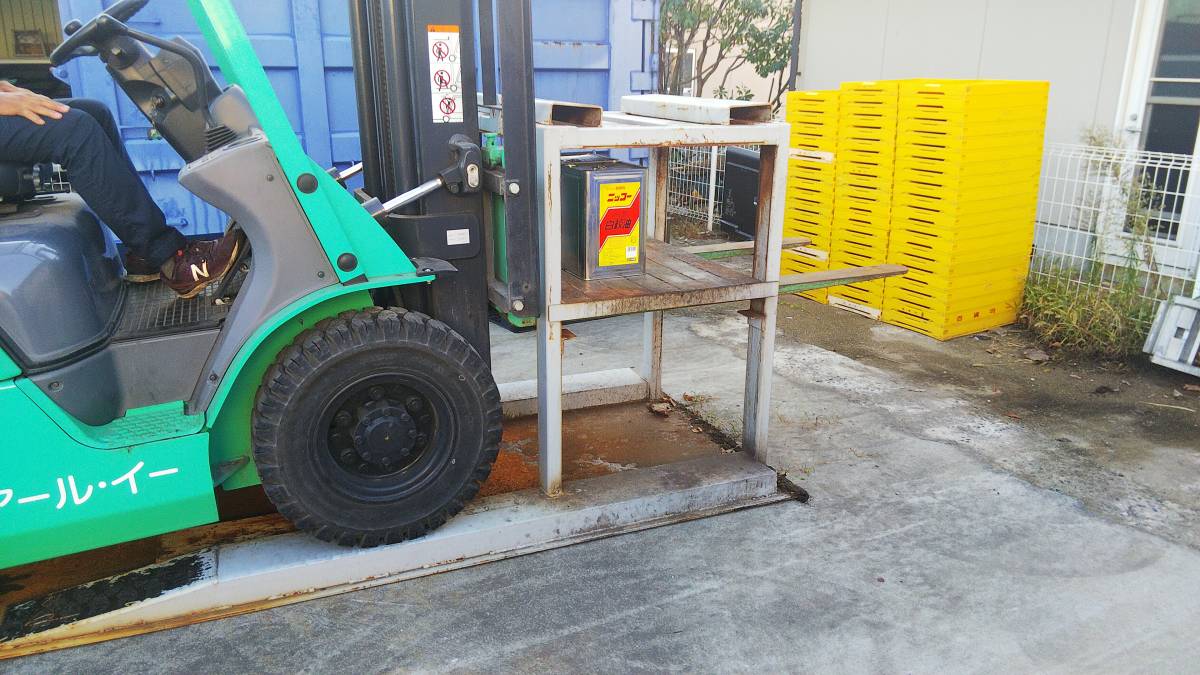 ・ フォ-クリフトの爪を上昇させて缶を圧縮します。