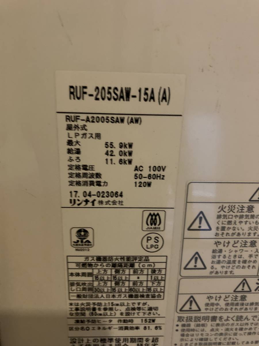 美品 リンナイ LPG RUF-205SAW-15A 使用約2年