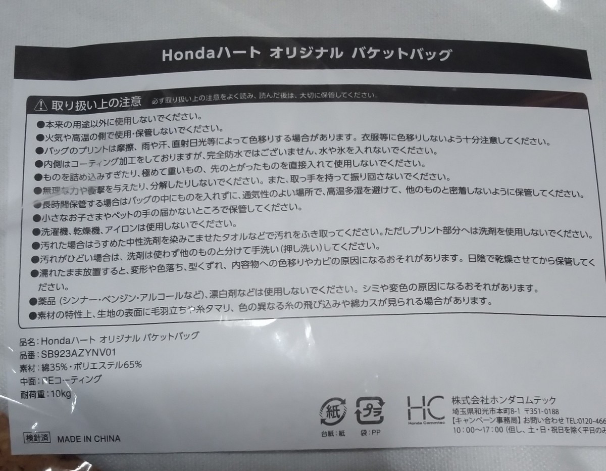 HONDAノベルティーのバケットバッグです。サイズはおよそ底面の直径25cm.深さ35cm.持ち手23cmです。