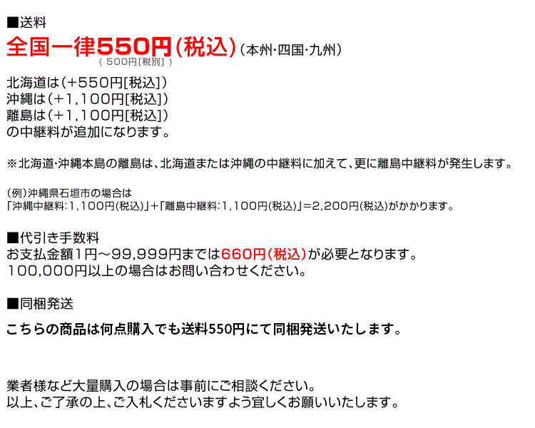 ▼ 商品に関するお問い合わせはこちら ■対応時間 10:00~15:00 土日祝日休業 ※商品に関するお問い合わせや初期不良等のご連絡はやり取りの履歴を残すために、 お手数ではございますが、必ず下記のメールアドレスにご連絡ください。 qgbvr82114@yahoo.co.jp ▼ 営業日・支払い方法・発送・返品・交換・保証に関して ※必ずお読みください 営業日・支払い方法・お届けについて・返品・交換・保証に関する件は、以下のページにて詳しく記載しております。 営業日掲載ページはこちら 営業日カレンダー掲載ページ 支払い方法・お届けについて・返品・交換・保証に関する掲載ページはこちら お買い物ガイド詳細ページ プライバシーポリシーに関する掲載ページはこちら プライバシーポリシー記載ページ ▼ 質問が多かった即決落札について 即決で落札する方法 即決で落札するには ├PC版の場合は、商品画像右の「今すぐ落札する」をクリックします。 └スマホ版の場合は、(1)「入札する」をタップします→(2)最高入札額記入欄に、即決の金額(税抜)をご記入頂ければ即決できます。 入札→即決落札した場合の履歴に関して ご入札頂いているYahoo_IDで即決価格で再度ご落札して頂ければ、前の入札の履歴は残りますが前の分はキャンセルとなり、即決価格のみでのご落札となります。重複しませんのでご安心ください。 ▼ オークションに関して 入札後の各種確認メールについて 当店からの受注確認メール・入金確認メール・発送確認メールが「迷惑メールフォルダ」に自動で振り分ける場合がございます。 「フォルダを空にする」前にメールが届いているか一度ご確認ください。 ご落札の際は、以下3つの当店メールアドレスが届くように受信設定をお願いいたします。 wm-world@weiec.jp w_m_world@yahoo.co.jp qgbvr82114@yahoo.co.jp 当店からの各種確認メールは、オーダーフォームに登録のメールアドレス宛に送信されます。 取引方法 手渡しでの直接取引には対応できません。物流業務を委託していますので、 お近くにお住まいの方でも商品のお受け取りに来ていただくことはできません。 在庫について 当社では、卸販売など各方面でも商品を同時販売しております。 在庫情報は随時更新(新規出品の停止、個数少数での出品、出品取り消しなど)させて頂いておりますが、ご落札頂いた際に時間差などで売り切れになる場合もございます。 予めご了承ください。 キャンセルについて 入札後のキャンセルは一切お受けできません。 やむを得ぬ事情により落札後キャンセルをされる場合には、落札者都合によるキャンセルとなり、 オークションのシステム上自動的に落札者にマイナス評価がつきます。 ご了承ください。 落札後3日以内にご連絡が取り合えないお客様についてはやむを得ずキャンセル処理をさせていただく場合もあります。 商品の価格について 当サイトでは、正確な価格表示に努めておりますが、 万が一表示価格やご注文商品の金額に誤りがあった場合、誤表記を理由にご注文を取り消させていただくことがございます。 取り消しに際し、お客様にはメールにて販売価格をお知らせしご注文を継続されるか否かのご確認をさせていただきます。 なお、これによりお客様にご不便やご迷惑をおかけした場合でも、 直接的または間接的な損害についての補償は致しかねますことを、何卒ご理解のほどお願い申し上げます。 交換返品返金について お客様都合での、交換・返品・返金は一切対応できません。 評価について 著しく評価の悪い方の入札はご遠慮願います。 領収書発行について 商品代引きご利用の場合は、伝票が領収書となりますので、別途領収書の発行はできません。 領収書発行希望のお客様は入札後、オーダーフォーム要望欄に必ず「領収書発行希望」をご記入の上ご連絡ください。 |