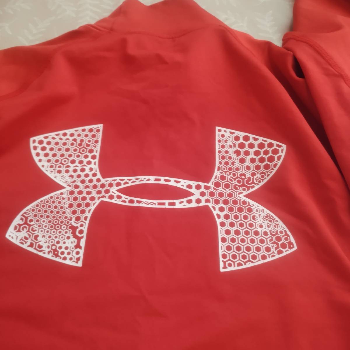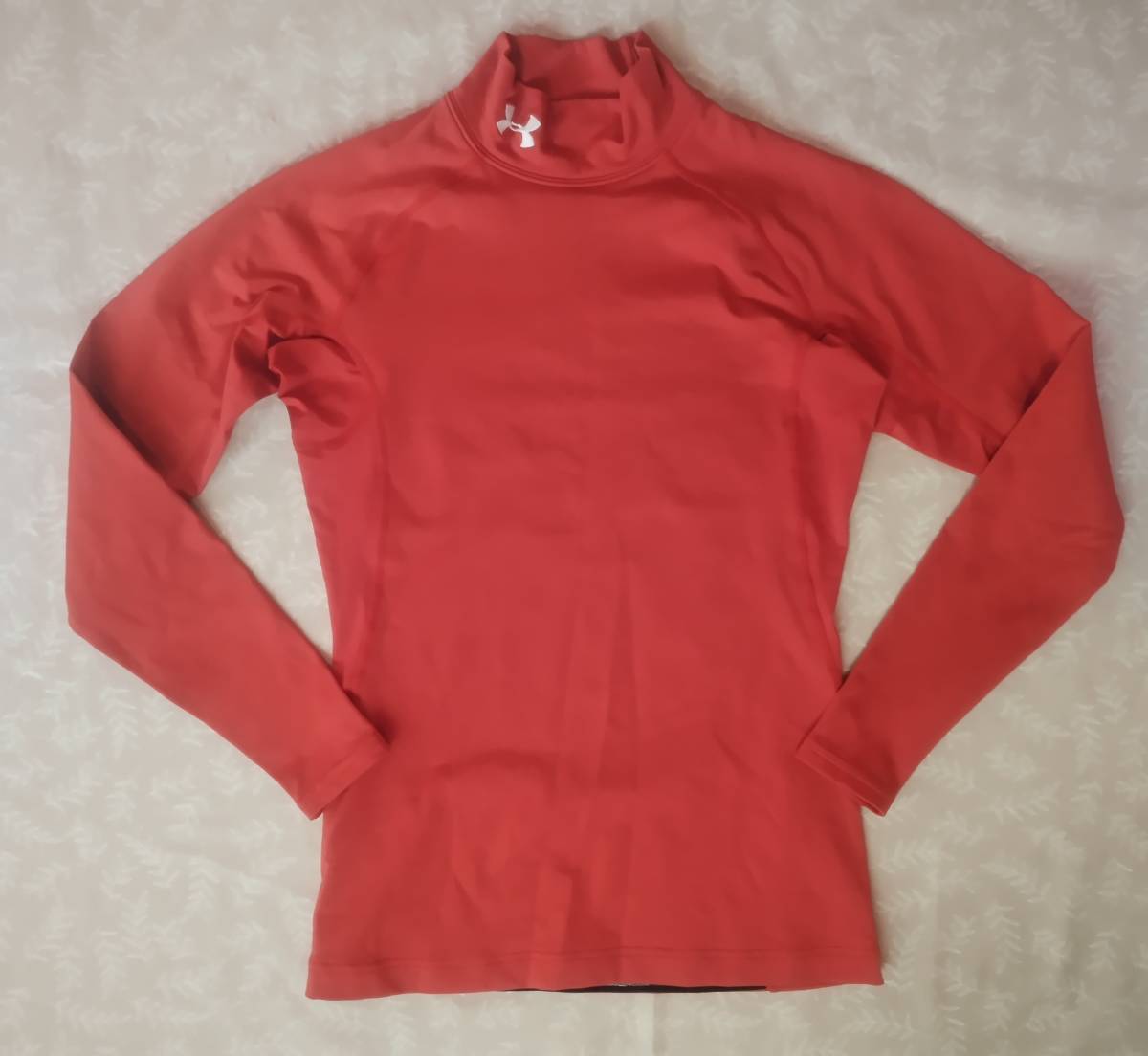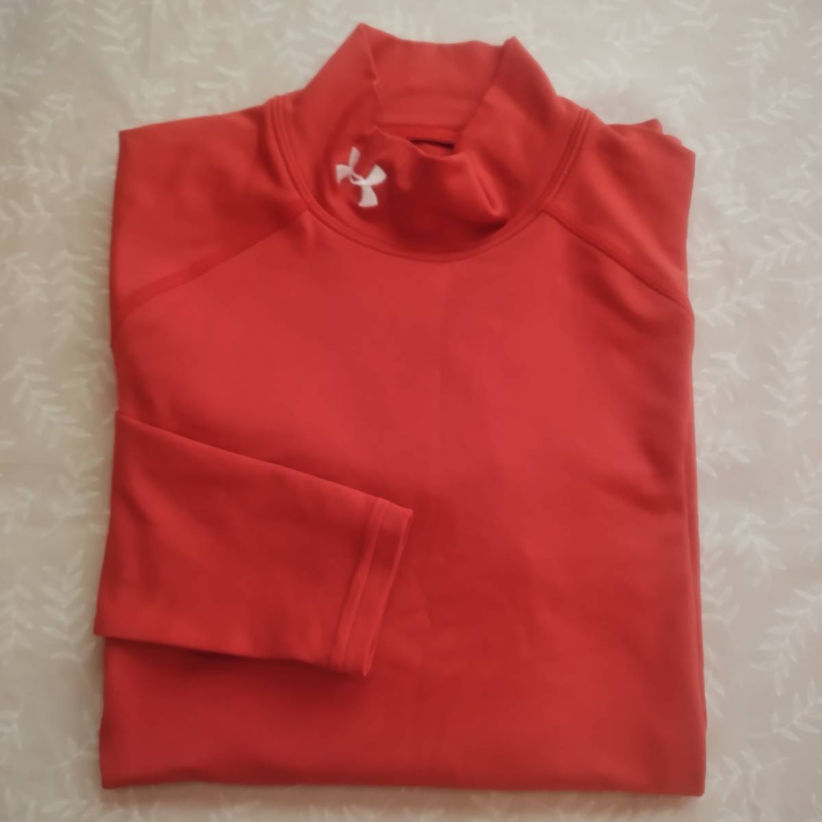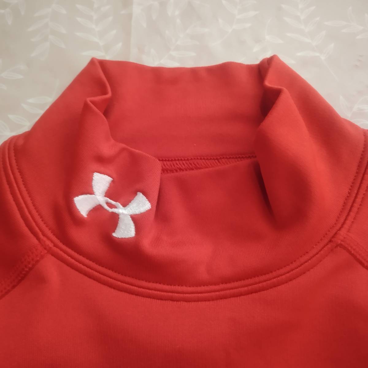 美品! アンダーアーマー コンプレッション系 長袖シャツ サイズMD やや光沢レッド 背面プリント 超ストレッチ 薄手生地