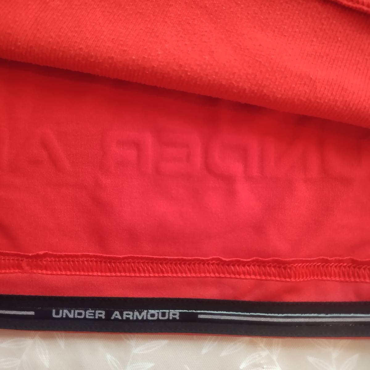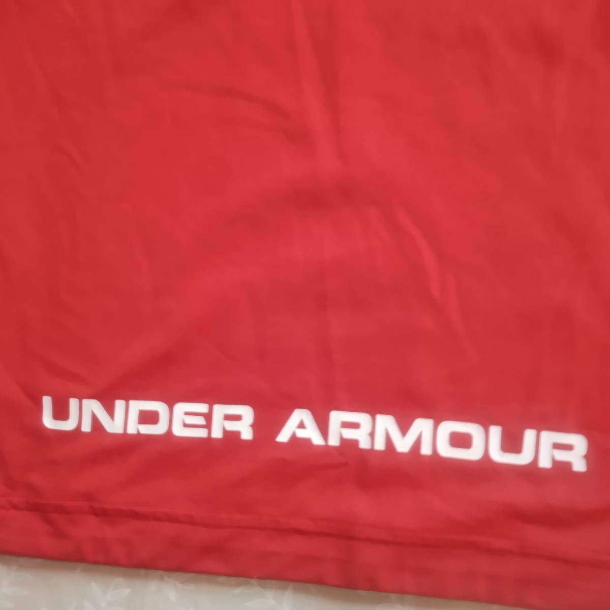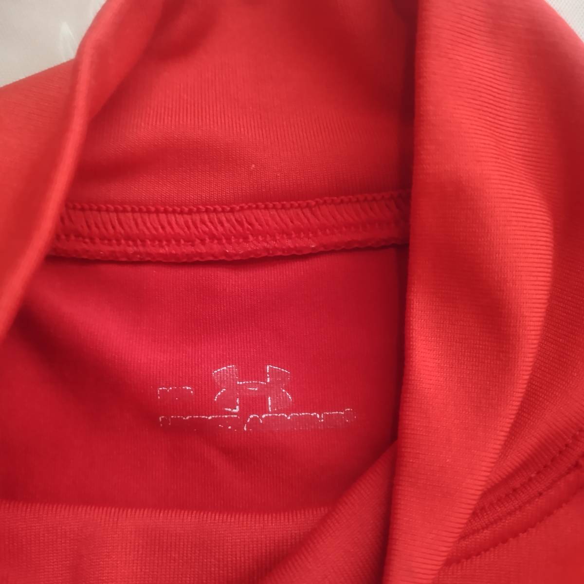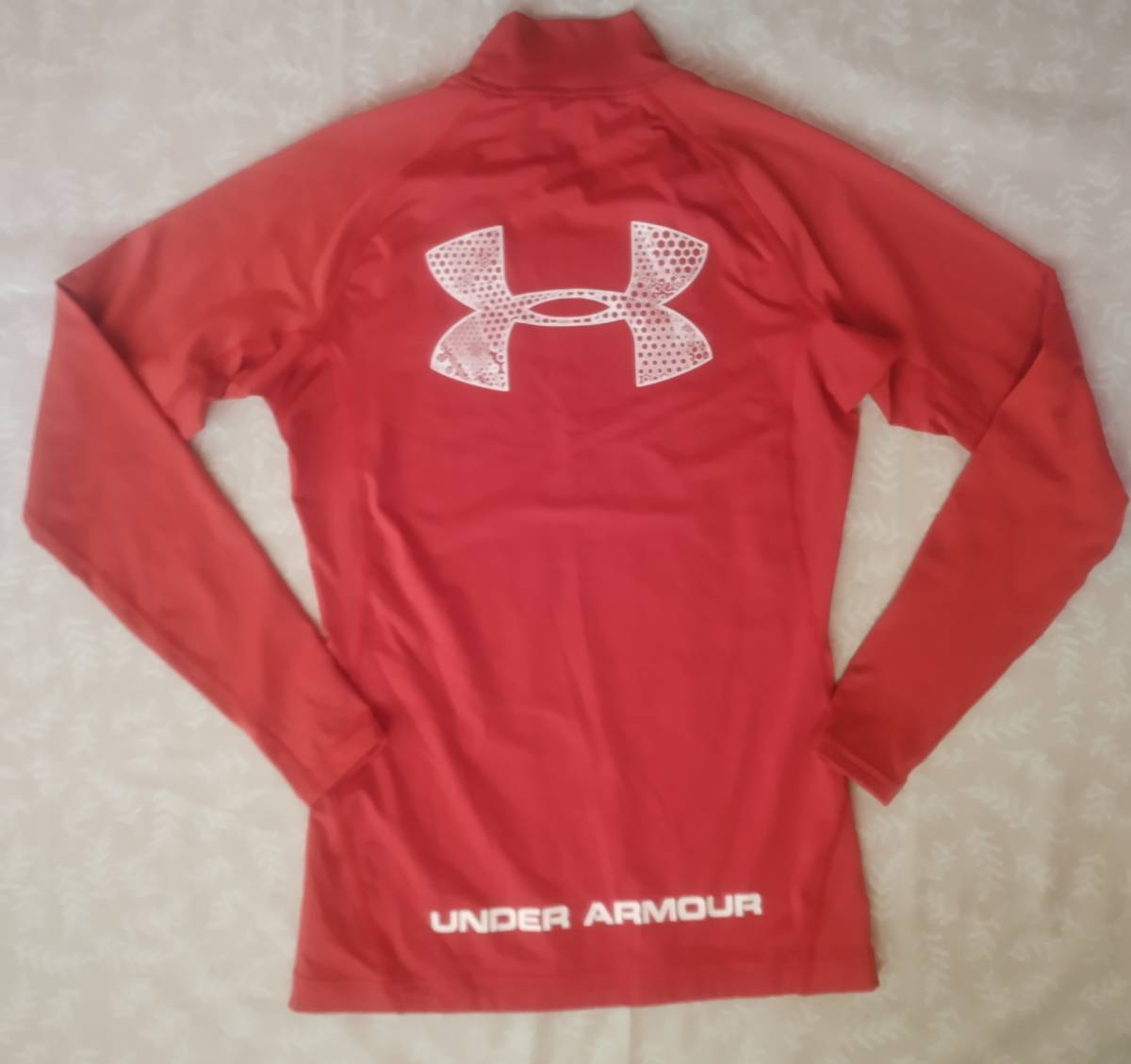 美品! アンダーアーマー コンプレッション系 長袖シャツ サイズMD やや光沢レッド 背面プリント 超ストレッチ 薄手生地