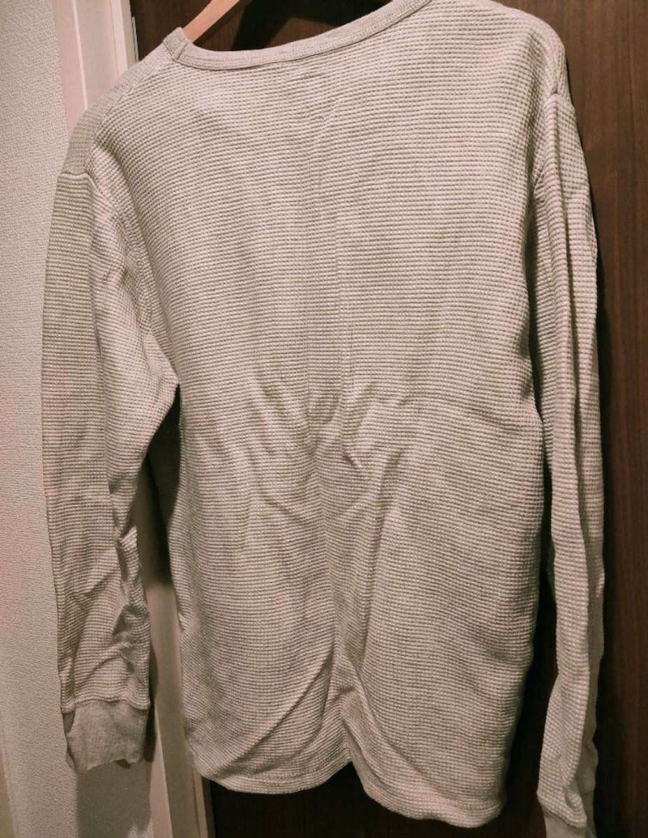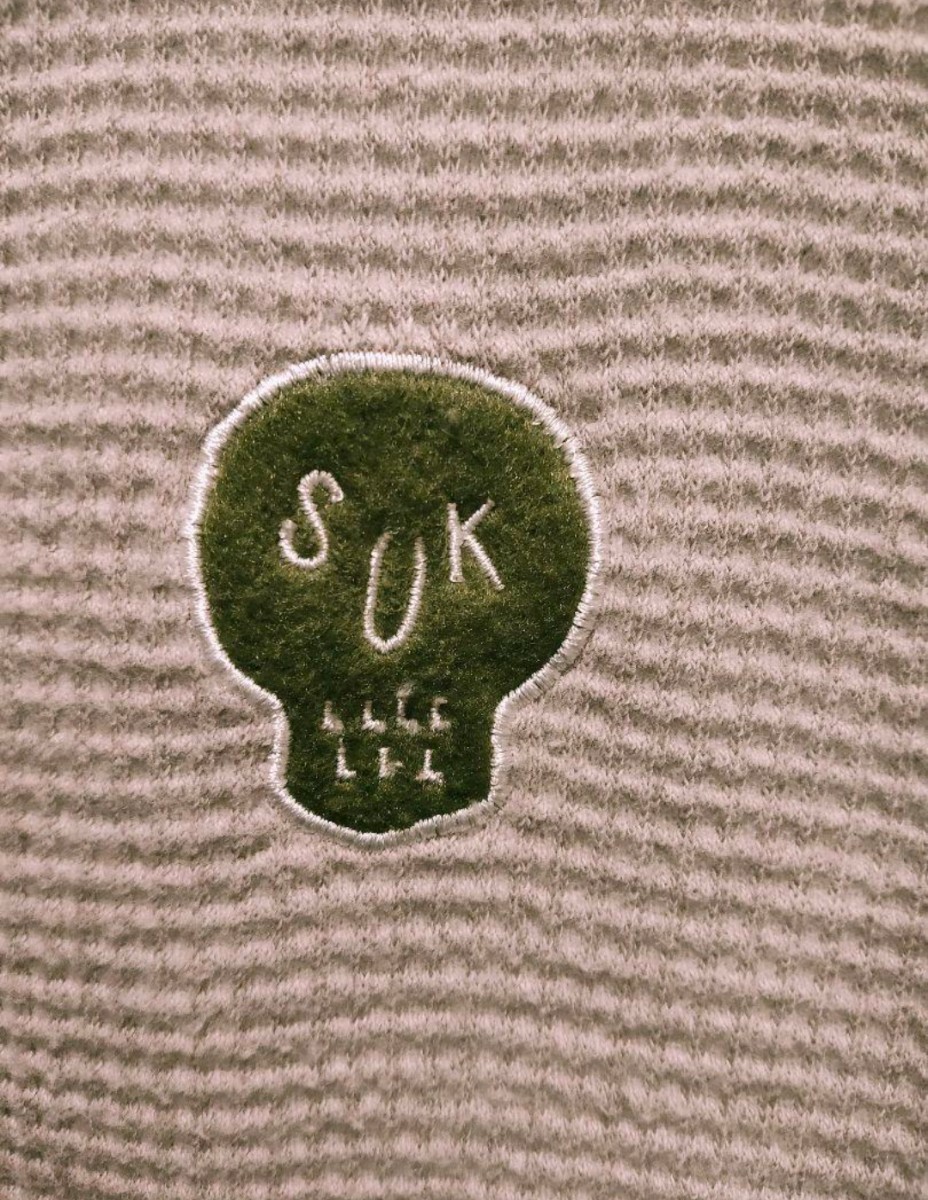 2層構造のワッフル生地を使用し、表と裏の糸の色を変える事により、より立体的な雰囲気に仕上げています。左胸のフエルトアップリケもポイントです。