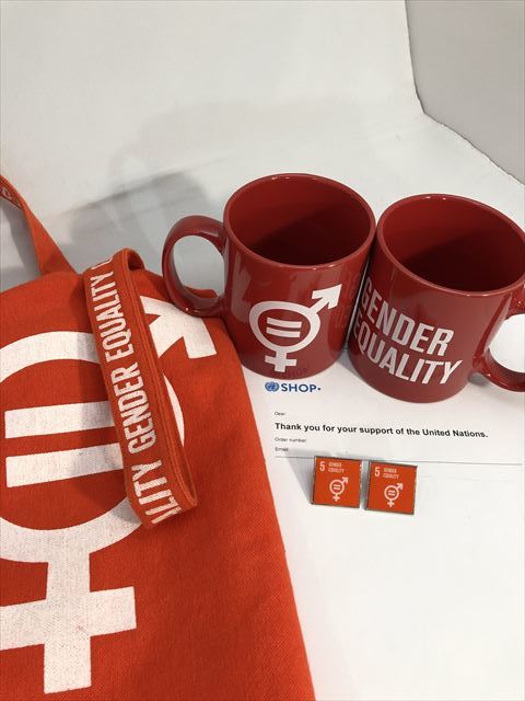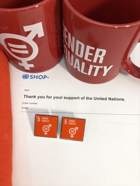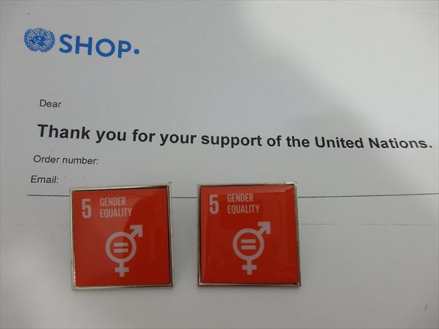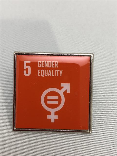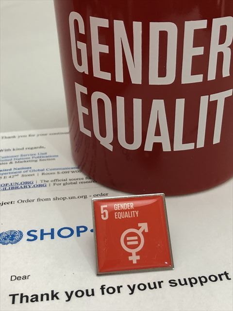 SDGsピンバッジ 2個(2090円税込)(5: ジェンダー平等の実現 ・ジェンダーイコール(国連ブックショップ購入・送料無料)(再生素材)UN32