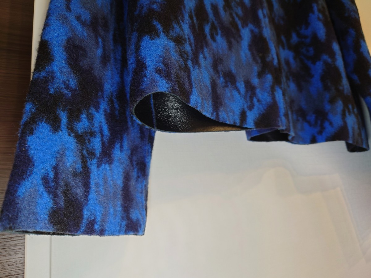 タグが切られているので詳しい材質は不明ですが、迷彩柄のメルトン生地と薄めのレザー生地(おそらく本革)を貼り合わせているようです。あくまで材質タグが無いので参考程度にお願いします。
