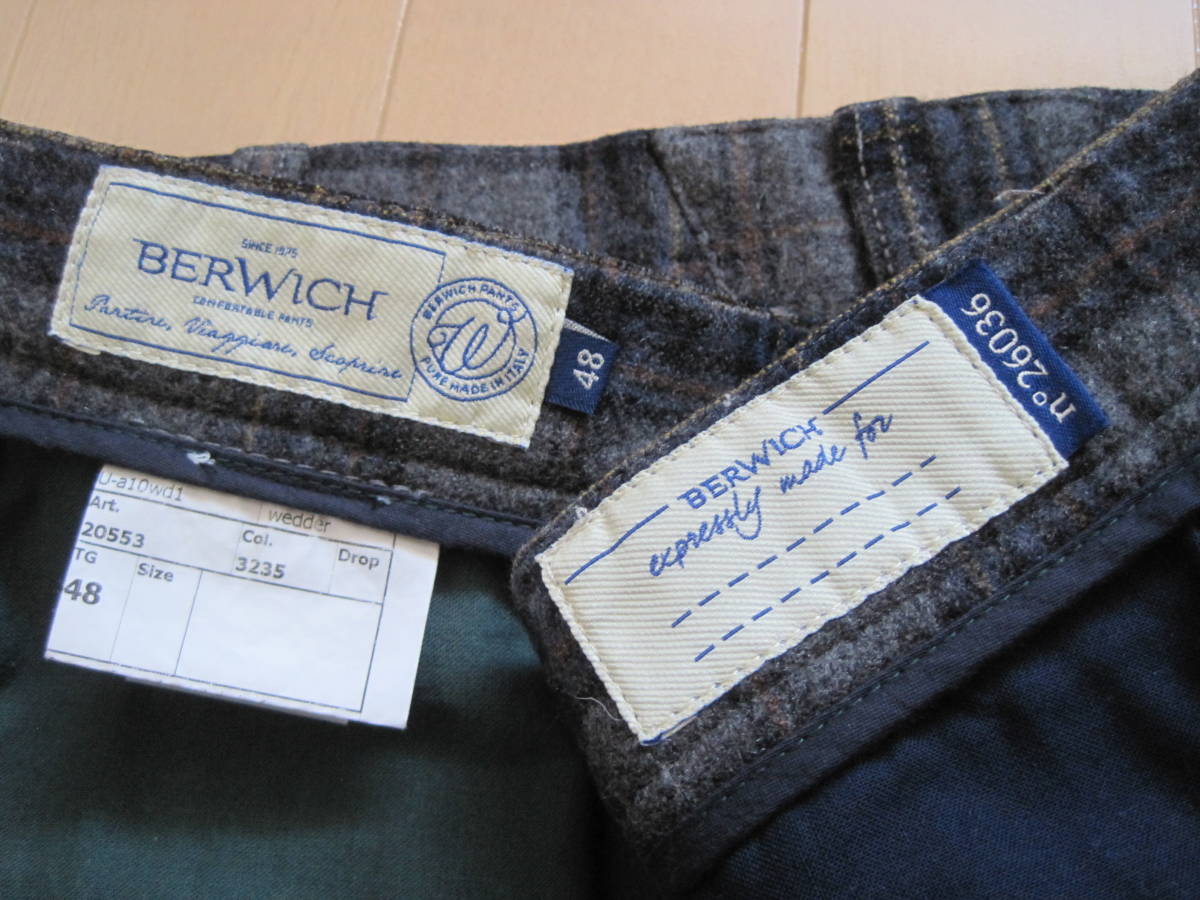 BERWICH ベルウィッチ wedder ウールパンツになります。多少の着用感がありますが、特に目立つ傷、汚れはありません。カラーはグレー系のチェック、サイズは48、毛100%、イタリア製です。ウエストは41cm、股下72.5cm、モモ幅27cm(股下10cmで)、スソ幅18.5cmです。素人の採寸ですので若干の誤差、商品状態はご了承ください。 落札後は、ノークレーム、ノーリターン、ノーキャンセルでお願いします。 発送方法はレターパックです。ほかにも色々出品していますので良かったらご覧ください。