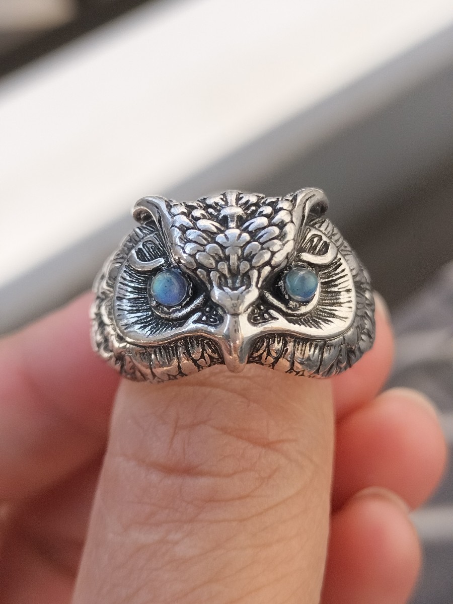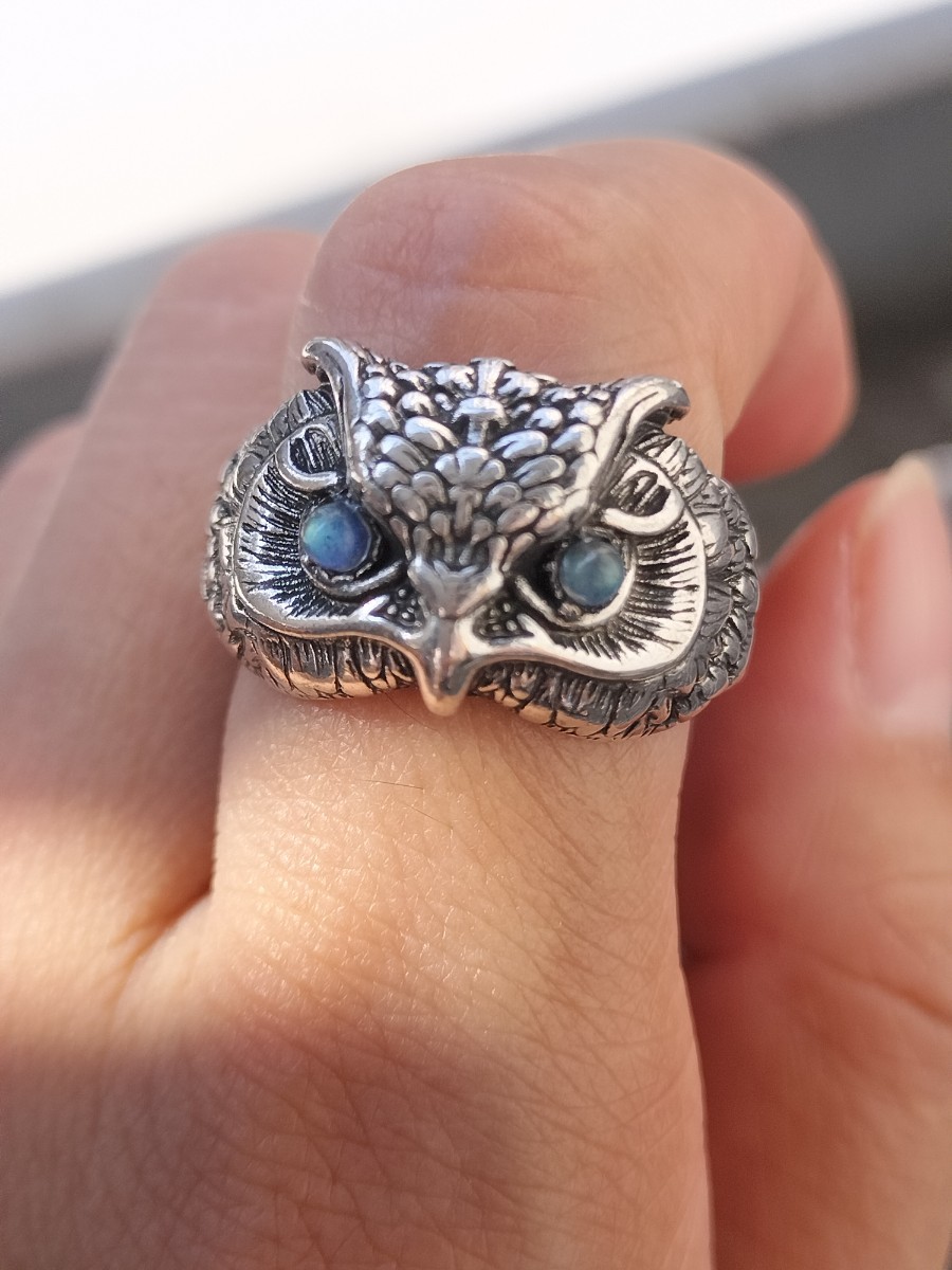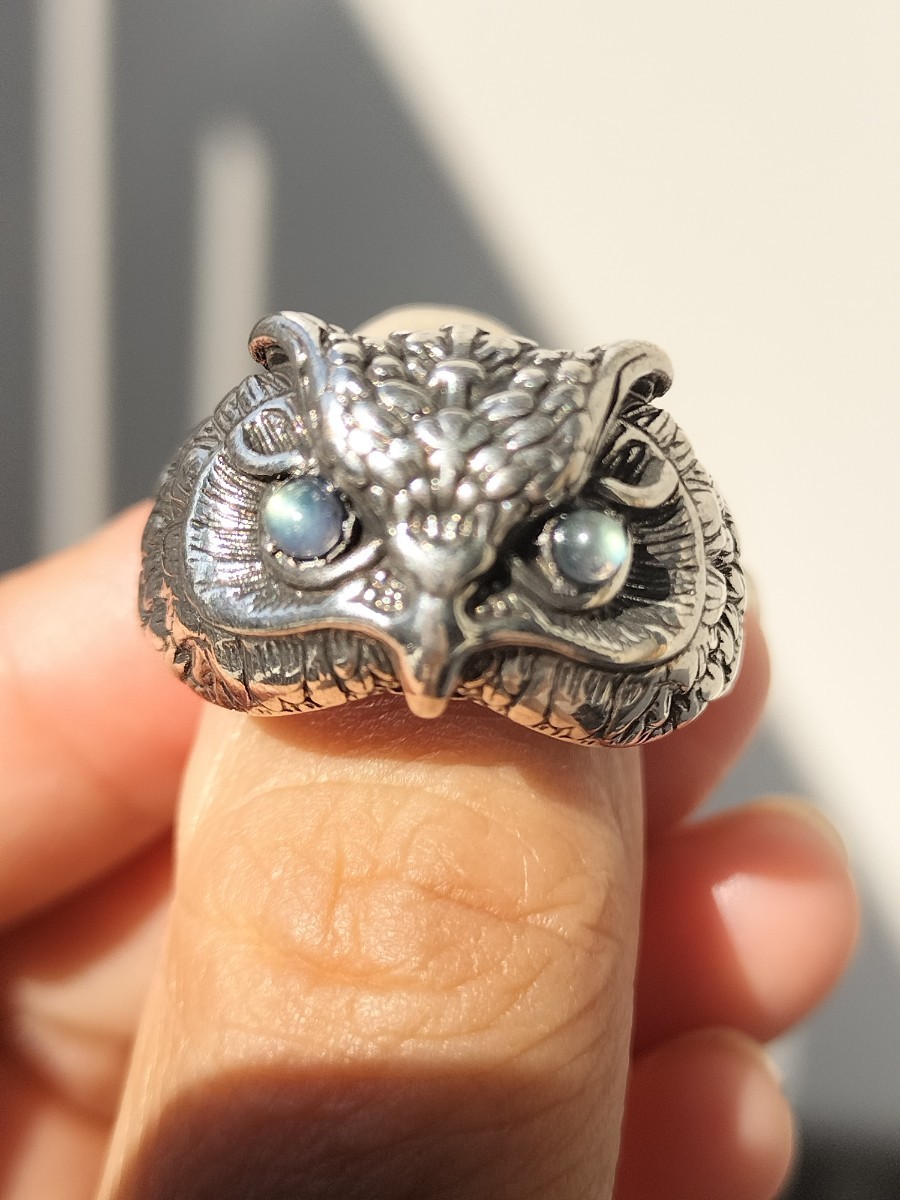 ブルーシラーの目の輝きがとても可愛いフクロウのリングです。