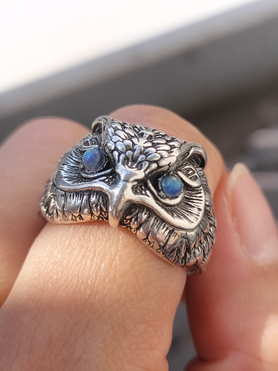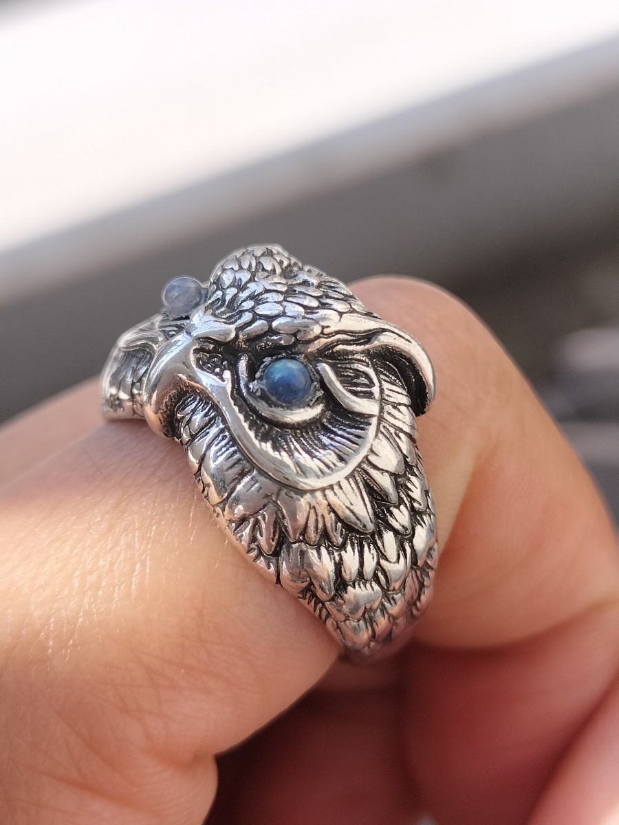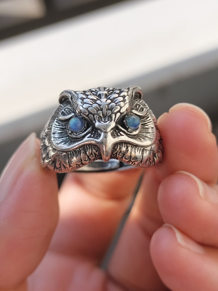 ブルーシラーの目の輝きがとても可愛いフクロウのリングです。