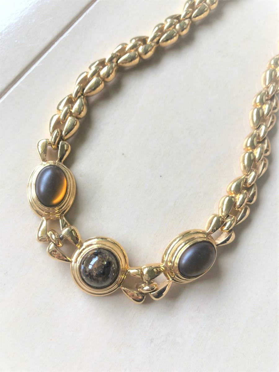 全長約42.5㎝で、トップ部分の幅は約1.8cmです。太めのチェーンが存在感があり素敵なデザインです。トップのカラーストーンは天然か人口石か分かりかねます。ブラウンカラーです。
