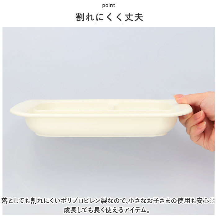| 商品説明 | ・・お子さまの食事にぴったりな、可愛らしいキャラクターデザイン☆ワンプレートで盛り付けできる「PP製ランチプレート」が新登場。 ・【お子さまが上手に食べられる形状】 ・奥側はなだらかな形状で食材を集めやすく、手前はほぼ直角の立ち上がりですくいやすい!フチ付きで持ちやすいのもポイント。8ヶ月頃からのお食事練習に! ・【割れにくく丈夫】 ・落としても割れにくいポリプロピレン製なので、小さなお子さまの使用も安心◎成長しても長く使えるアイテム。 ・【ワンプレートごはんが完成】 ・・3つのスペースに仕切られた容量470mlのプレート。仕切りは食べ物がはみ出しにくい高さに設計されており、ごはんとおかずが混ざることなく1皿に盛り付けOK。 ・【使い勝手ばっちり】 ・食洗機に対応しているから、忙しい毎日の味方☆耐熱性に優れた素材なので、電子レンジでの温めもOK。 ・【いつも清潔をキープ】 ・銀イオン抗菌を施した、安心の日本製◎熱湯・薬液消毒も可能。(※すべての細菌の増殖を抑制するものではありません。煮沸消毒は不可。) ・【キャラクターと一緒に楽しく♪】 ・キュートなキャラクターの絵柄入り☆毎日一緒に、楽しくお食事できちゃう! |