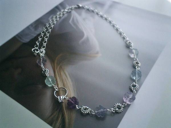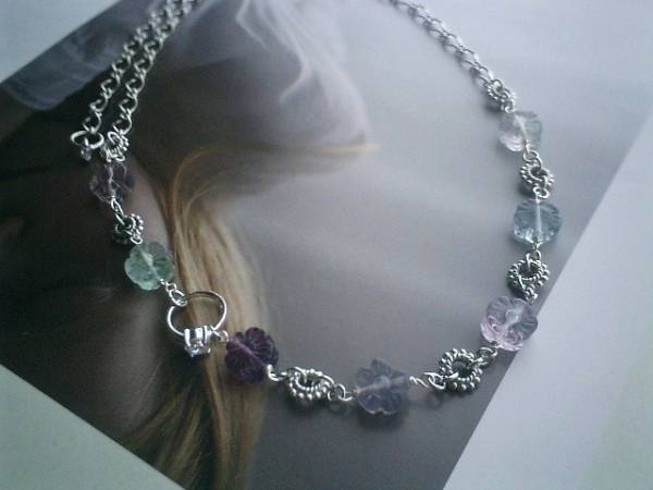 薔薇の帽子箱・・シリーズです♪アリスを探して・・可憐なフローライトのネックレスです♪♪10ミリ位のお花のフローライトにジルコニアのリングやデザインリングを合わせてロマンチックな表情です♪長さは全長56センチ位で調節自由です♪チョーカー風にされてもブレスにされても可愛いです♪お揃いのブレスレットやイヤリングも出品しています♪♪シンプルで飽きのこないいつまでも着けられるデザインを考えて作りました!ハンドメイドをご理解頂いてノークレーム、ノーリターンでお願いします